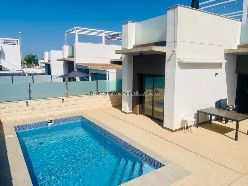 La villa cuenta con tres dormitorios, dos baños completamente alicatados y un amplio salón de concepto abierto con cocina, que crea un ambiente luminoso y social.