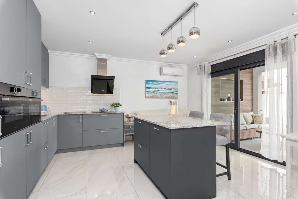 La cocina de estilo independiente está equipada con electrodomésticos de alta gama y una isla central. El diseño fluido y abierto se integra perfectamente el diseño de la casa, creando un espacio ideal para convivir y disfrutar del tiempo en familia o con amigos. Desde el salón, las vistas panorámicas se abren ante ti, proporcionando un ambiente relajante y luminoso.