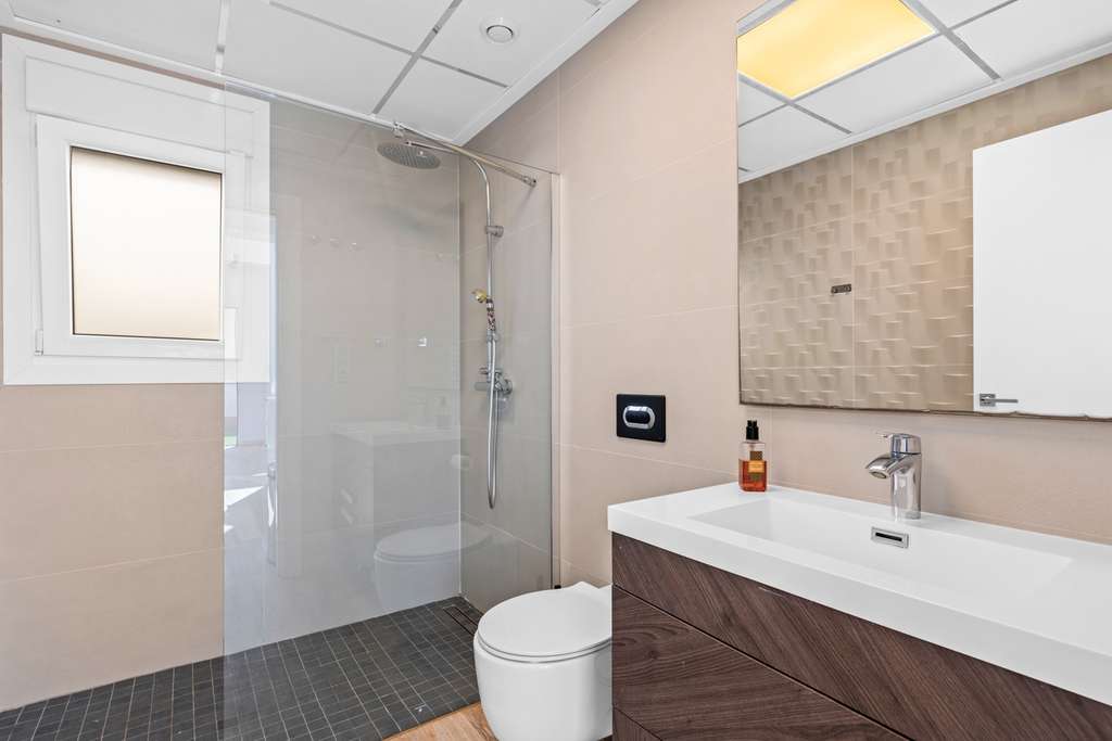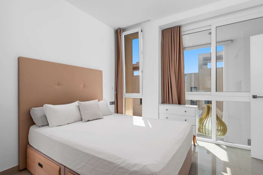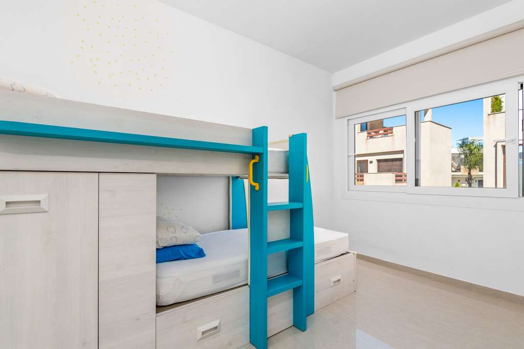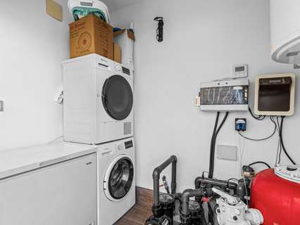 En la planta baja, dispone de un salón con cocina integrada, un baño completo, un dormitorio y una zona de lavandería equipada con lavadora y secadora de 8 kg. En la primera planta, se encuentran dos dormitorios adicionales, uno de ellos con baño en suite y acceso a una terraza privada. La planta superior cuenta con un solárium con espacio para una cocina exterior y la instalación de un jacuzzi.