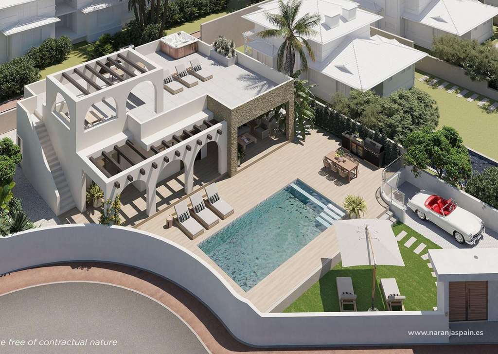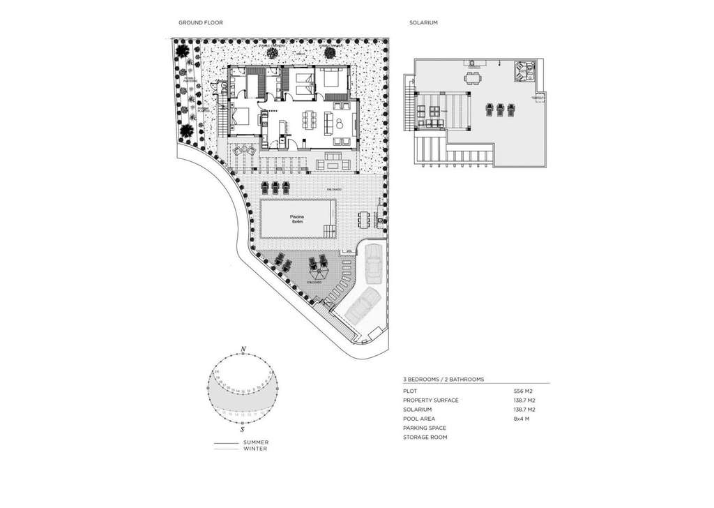 Villa construida en 1 planta, con 3 dormitorios y 2 baños, cocina americana con salón, armarios empotrados, solarium privado, jardín privado con piscina y plaza de aparcamiento.