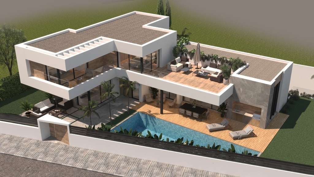 La propiedad se encuentra en una soleada parcela de 700 m² con piscina privada , amplias terrazas y vistas panorámicas de la zona y del mar Mediterráneo.