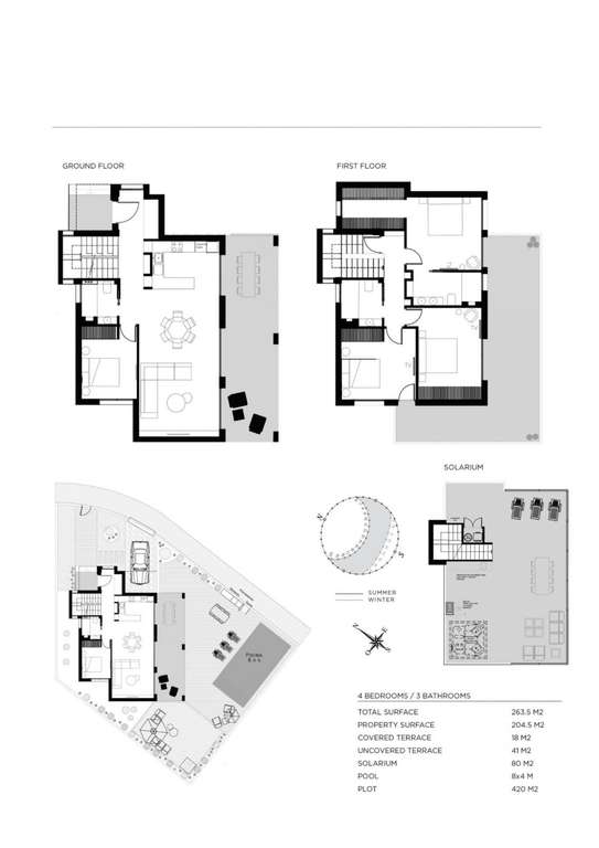 Villa dispone de salón-comedor con cocina americana, 4 dormitorios y 3 baños, solarium, jardín privado, piscina y plaza de aparcamiento.
