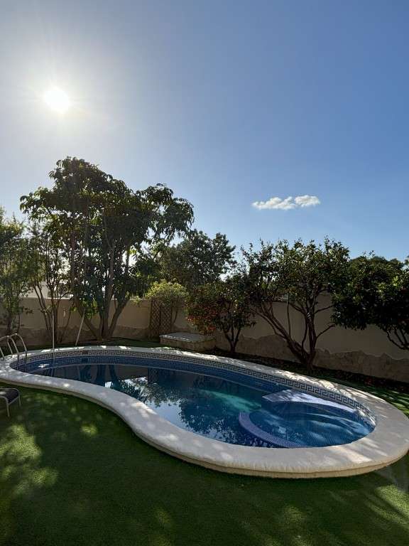 Chalet independiente con piscina privada en venta en Ciudad QuesadaUbicado en la prestigiosa zona de Ciudad Quesada, este magnífico chalet independiente ofrece una combinación perfecta de confort, amplitud y ubicación privilegiada. A pocos minutos de todos los servicios necesarios, como supermercados, tiendas, bancos, centros médicos, farmacias y una amplia oferta de bares y restaurantes con cocina local e internacional. Las playas de Guardamar del Segura se encuentran a tan solo 8 km.Distribuida en tres plantas, la vivienda cuenta con 5 amplios dormitorios y 4 baños completos, lo que la hace ideal para una familia numerosa o para quienes disfrutan de recibir visitas.Distribución:Al llegar a la vivienda, se accede a una terraza delantera de 30 m², perfecta para disfrutar del clima mediterráneo. El amplio y luminoso salón está dividido en zona de chimenea, área de televisión y comedor. La cocina independiente está completamente equipada con electrodomésticos y muebles hechos a medida en madera maciza de cerezo, que se integran armoniosamente en el interior. Desde la cocina se accede directamente al patio con zona de barbacoa, ideal para reuniones al aire libre.En la planta baja también hay un baño totalmente reformado en 2024.La primera planta dispone de cuatro dormitorios, uno de ellos actualmente utilizado como despacho. Desde el segundo dormitorio se accede a una gran terraza de 30 m² con vistas abiertas a zonas verdes, el parque y las salinas de Torrevieja. El dormitorio principal cuenta con vestidor y baño en suite con ducha. Además, hay un segundo baño completo con bañera. El suelo de esta planta es de parquet natural de roble, aportando calidez y elegancia.En la planta semisótano se encuentra una sauna privada y un gimnasio, perfectos para el bienestar y la relajación. También dispone de cuarto de calderas, lavadero, un dormitorio adicional y un baño, lo que lo convierte en un espacio ideal para invitados o como zona independiente.Comodidades y extras:Aire acondicionado y calefacción por suelo radiante con líquido refrigerante (funciona con gasóleo y proporciona también agua caliente)Sistema de seguridad con videovigilanciaSituado en una calle sin salida, lo que garantiza tranquilidad y ausencia de tráficoPiscina privada y jardín con árboles frutalesZona de barbacoa y acceso directo al parqueGaraje privado con capacidad para dos cochesOrientación sureste, que garantiza luz natural en todas las estancias durante todo el díaSe vende completamente amueblado y equipadoCaracterísticas principales:Superficie construida: 360 m²Parcela: 850 m²5 dormitorios, 4 baños3 plantasVarias terrazas y balconesEsta villa es una oportunidad única de disfrutar de una vida de lujo en la Costa Blanca, con amplios espacios, privacidad, confort y todos los servicios al alcance de la mano.