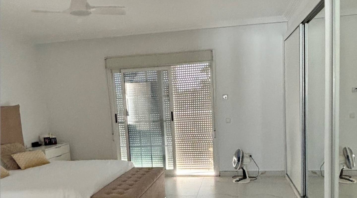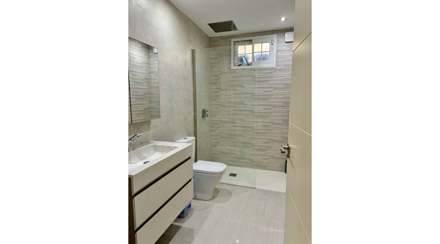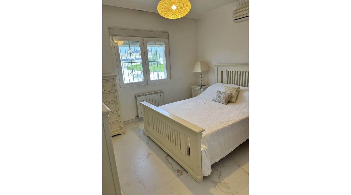 En el interior, la villa desprende elegancia. Un gran salón-comedor con ventanales arqueados de suelo a techo baña la estancia de luz natural, creando un ambiente luminoso y aireado. La moderna cocina de concepto abierto, con acceso a la terraza trasera, es perfecta tanto para la vida diaria como para recibir invitados, mientras que la práctica lavandería independiente ofrece comodidad adicional. Dos amplios dormitorios dobles con armarios empotrados, un baño familiar y un aseo de invitados completan la planta principal.