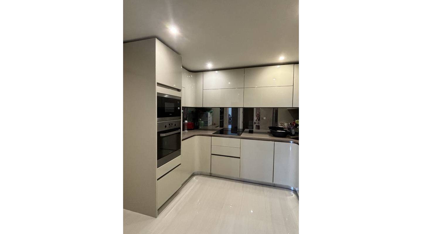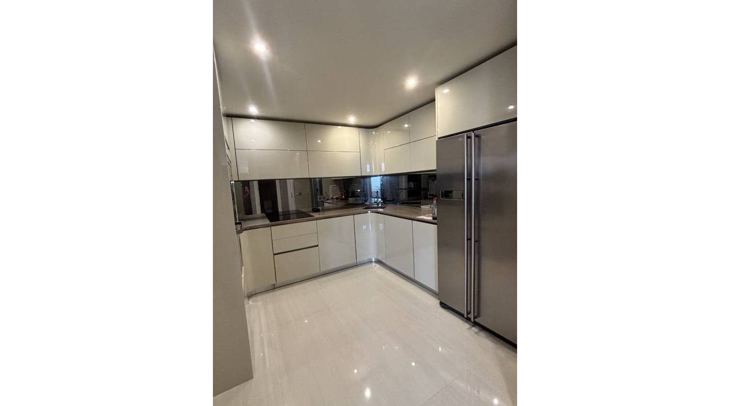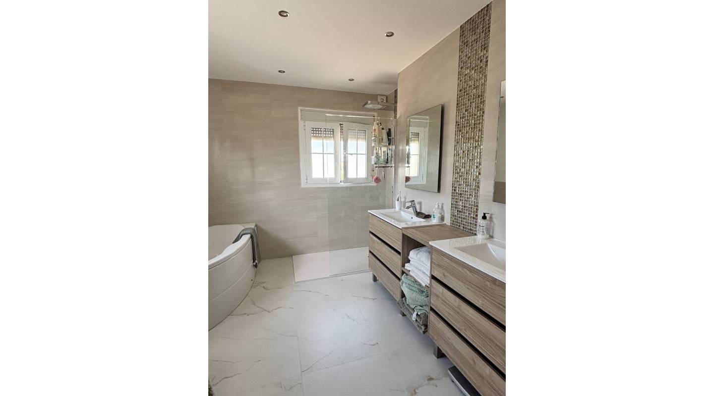 En el interior, la villa desprende elegancia. Un gran salón-comedor con ventanales arqueados de suelo a techo baña la estancia de luz natural, creando un ambiente luminoso y aireado. La moderna cocina de concepto abierto, con acceso a la terraza trasera, es perfecta tanto para la vida diaria como para recibir invitados, mientras que la práctica lavandería independiente ofrece comodidad adicional. Dos amplios dormitorios dobles con armarios empotrados, un baño familiar y un aseo de invitados completan la planta principal.