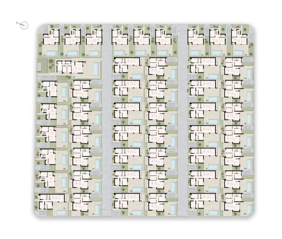 Bungalows: Unidades de planta baja con jardín privado u opciones de planta alta con solárium. Todos los bungalows incluyen dos dormitorios, dos baños, una plaza de aparcamiento y un trastero, alrededor de una zona comunitaria central con piscina y jardines paisajísticos.