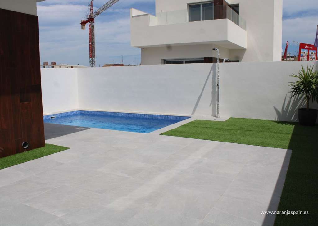 Características: preinstalación de aire acondicionado, grifería monomando, iluminación led, suelo radiante en baños (opcional), paredes internas de ladrillo, persianas eléctricas en toda la casa, jardín cubierto de césped y losas, estructura de hormigón armado con sanitarios ventilados, exteriores. Cerramientos con aislamiento y cámara de aire para mejorar el confort, puertas de paso lacadas en blanco con tiradores de acero inoxidable, puertas de entrada blindadas de máxima protección, mecanismos eléctricos Niessen, cocina de diseño en color blanco y madera, calefactor liso, bomba de calor de bajo consumo, baños con lavabo, espejo. y ducha, piscina y plaza de aparcamiento.
