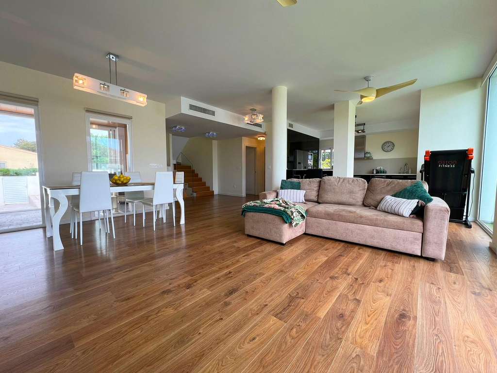 En la planta principal, encontramos un elegante recibidor, amplio salón-comedor con acceso directo a la zona de la piscina privada de 32 m², una cocina con barra americana, 1 dormitorio y 1 baño.