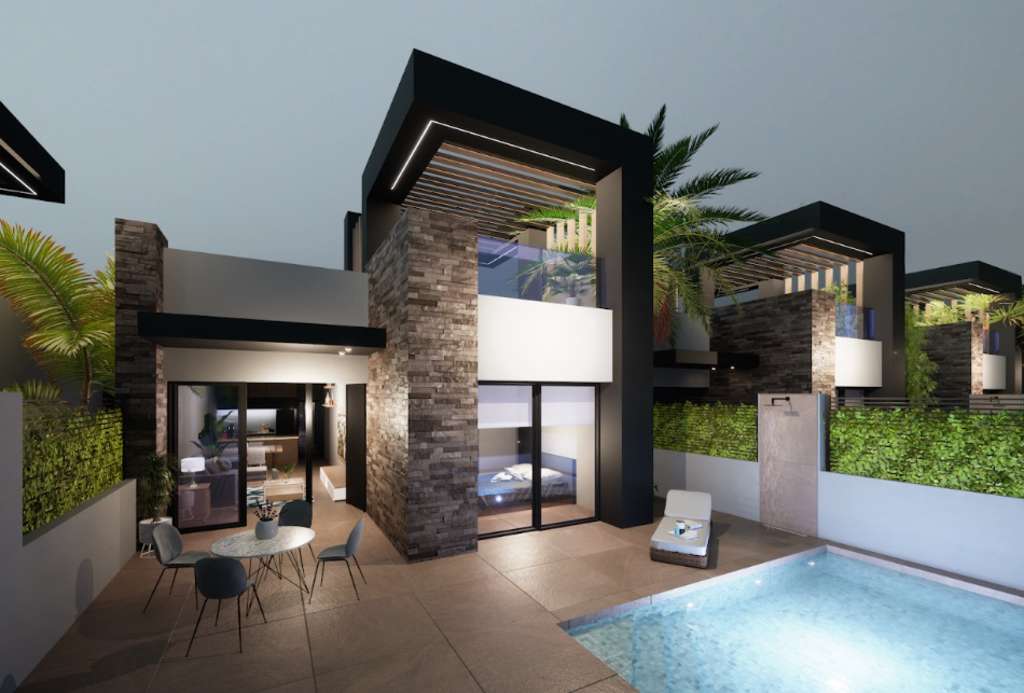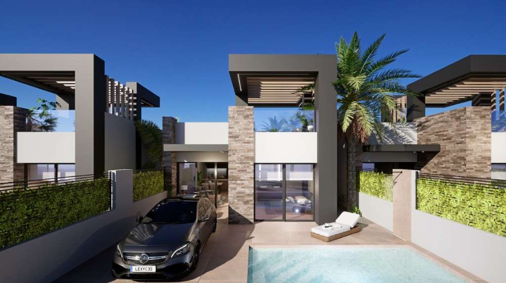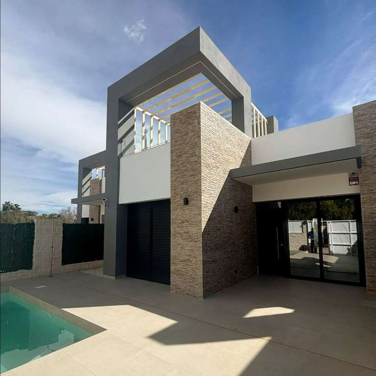 Villas de obra nueva en venta en San Fulgencio.Las villas cuentan con 3 dormitorios, 2 baños, salón, cocina, jardín privado y solárium. Opcional: piscina.San Fulgencio es una estupenda zona, situada cerca del mar en la zona de Guardamar del Segura y La Marina. La playa de arena más cercana está a solo unos minutos en coche. Aquí encontrará todo lo que necesita para una vida cómoda. A pocos minutos en coche se encuentran los parques naturales de Torrevieja y los centros comerciales, campos de golf, parking para yates y muchas otras actividades