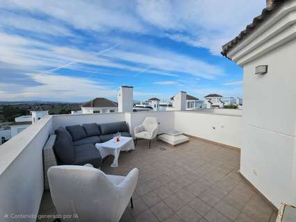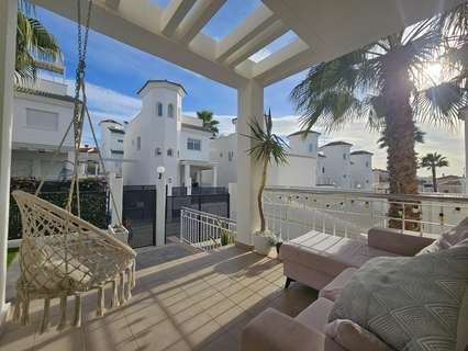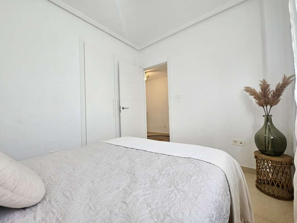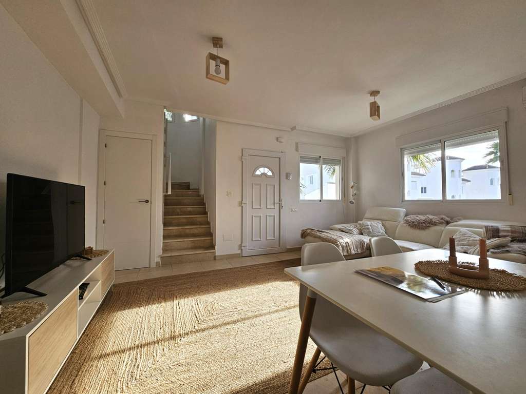 ¡Bienvenido a la casa de sus sueños en San Fulgencio, Alicante! Esta encantador semi pareado ofrece la combinación perfecta de comodidad y lujo. Con 3 dormitorios y 3 baños, esta luminosa y acogedora residencia es ideal para familias o para aquellos que aprecian el espacio. La cocina independiente está totalmente equipada, ofrece mucho almacenamiento y tiene acceso a un pequeño patio trasero. Cada habitación cuenta con aire acondicionado frío y caliente, lo que garantiza un ambiente agradable durante todo el año. Lo más destacado de esta propiedad son sus impresionantes zonas exteriores, que invitan al relax y al entretenimiento en medio de magníficas vistas panorámicas. Una zona ajardinada de bajo mantenimiento con césped artificial, terraza y preciosas palmeras y árboles frutales son perfectos para disfrutar de la vida en el exterior. El dormitorio principal, situado en la primera planta, da acceso a una gran terraza orientada al sureste con vistas a la piscina comunitaria y a las montañas en la distancia. El solárium ofrece 25 m² para celebrar una reunión nocturna bajo las estrellas o tomar el sol durante todo el día. Debajo de las escaleras encontramos un cómodo trastero. Situada a solo 5 km de playas con arena, podrá disfrutar de días soleados junto al mar siempre que lo desee. Además, al estar cerca de los servicios locales, todo lo que necesita está al alcance de la mano. Meticulosamente mantenida y en buen estado, esta casa promete una experiencia de mudanza sin preocupaciones. No pierda esta oportunidad de poseer un pedazo de paraíso: ¡programe su visita hoy mismo y dé el paso hacia un estilo de vida más brillante!