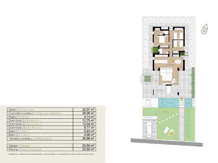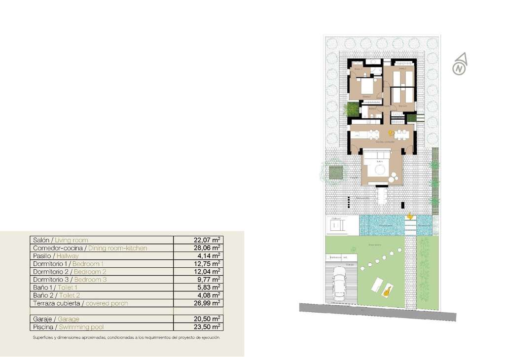 VILLAS DE OBRA NUEVA EN SAN FULGENCIO Villas de obra nueva San Fulgencio, a tan solo 5 km de la playa. Las villas ofrecen 3 dormitorios, 2 baños y amplia cocina, comedor, sala de estar, piscina con cascada y dos piscinas: piscina de chapoteo de 1,95x2,60 m y 0,6 m de profundidad, y piscina de 5,60x2,60 m, entre 1 y 1,5 m de profundidad variable. Un gran porche orientado al sur permite la continuidad del salón con el exterior, abriéndose a un moderno y funcional espacio exterior donde disfrutar de la piscina privada, barbacoa, chillout y amplia zona ajardinada que la rodea. Las líneas sencillas y claras del mobiliario contribuyen a su integración con el resto de la casa. Los detalles en madera aportan calidez al ambiente. Baños donde el color combinado con tonos naturales y cálidos, crean un ambiente acogedor, que unido a la relación directa con el exterior ,permite conectar con la naturaleza, consiguiendo grandes momentos de relax. El dormitorio principal dispone de un patio privado, que junto con la luz que penetra por sus ventanas, crea un ambiente relajante, perfecto para el descanso y la relajación. San Fulgencio es un pueblo agradable con varios restaurantes y tiendas y la ubicación es muy buena por su proximidad a las fantásticas playas de La Marina y al pueblo de Guardamar, un poco más grande. El pueblo de San Fulgencio está situado a unos 30 minutos del aeropuerto de Alicante-Elche, a 6 km del campo de golf más cercano y a sólo 5 km de la playa más cercana. 425
