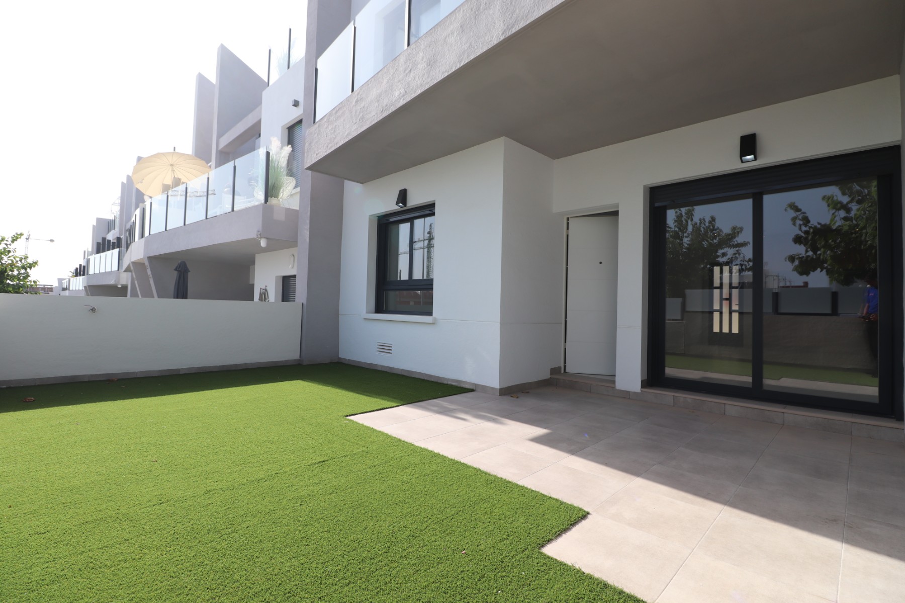 Este moderno apartamento de 2 dormitorios en planta baja, prácticamente nuevo, en San Miguel de Salinas, con menos de 12 meses de antigüedad, se encuentra a las afueras del pueblo, a solo 10 minutos a pie de tiendas y un supermercado. Tres campos de golf, incluido Villamartín, se encuentran a 10 minutos en coche, mientras que las impresionantes playas de Orihuela Costa están a solo 12 minutos. La propiedad ofrece un diseño contemporáneo con 65 m² de elegante espacio habitable. El salón de planta abierta es luminoso y moderno, con grandes puertas correderas de doble acristalamiento que dan directamente al jardín privado. La elegante cocina equipada tiene una puerta trasera, además de un lavadero y un trastero. Hay dos dormitorios dobles con armarios empotrados, con dos modernos baños con ducha, uno de ellos en suite con el dormitorio principal. El jardín delantero privado de 33 m² cuenta con césped artificial y una zona de baldosas, parte de la cual está cubierta, ideal para comer al aire libre y relajarse. Las características adicionales incluyen aire acondicionado, caldera de aerotermia y acceso a una magnífica piscina comunitaria con césped artificial y zona de parque. Esta propiedad, con menos de un año de antigüedad, combina comodidad moderna, bajo mantenimiento y una excelente ubicación: una opción fantástica para vivir todo el año en la Costa Blanca Sur.