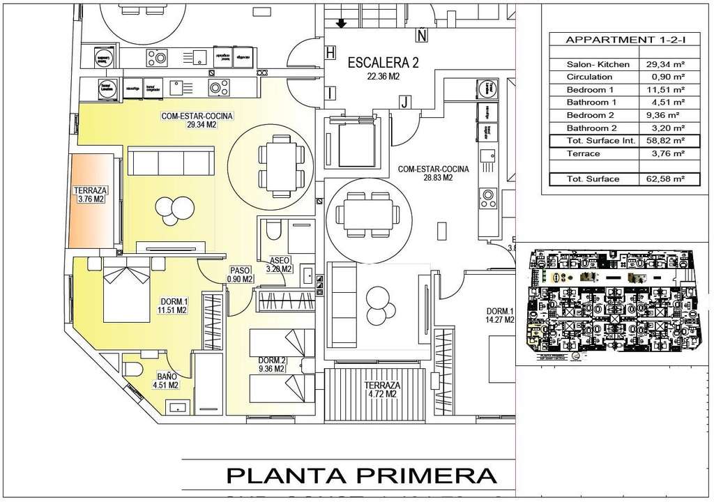 El proyecto consta de dos modernos edificios separados por una zona ajardinada comunitaria. Hay un total de 56 apartamentos contemporáneos disponibles con 1, 2 o 3 dormitorios, cada uno con terraza privada. Todas las viviendas han sido diseñadas pensando en la comodidad, la estética y la eficiencia energética, utilizando materiales de alta calidad y modernos sistemas de aislamiento.