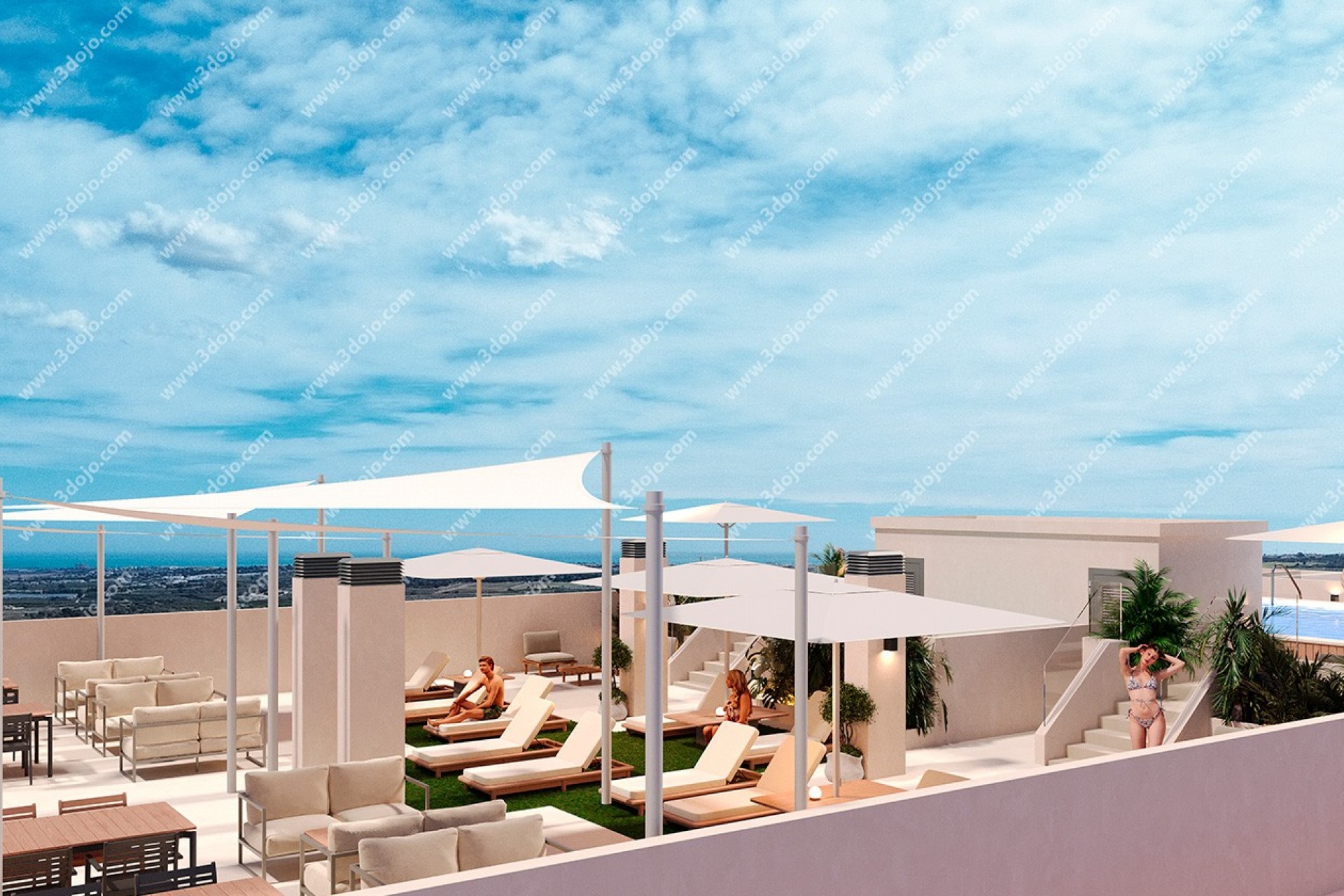 En la azotea, el proyecto ofrece una espectacular zona de ocio de aproximadamente 350 m², diseñada para el disfrute y la relajación. Este espacio cuenta con una piscina de 70 m² que incluye zona infantil, además de pérgolas, sombrillas y tumbonas, proporcionando un ambiente perfecto para descansar bajo el sol y contemplar las vistas panorámicas. El acceso es cómodo y directo mediante uno de los tres ascensores del edificio, y la zona dispone de los servicios necesarios para mayor comodidad de los residentes.