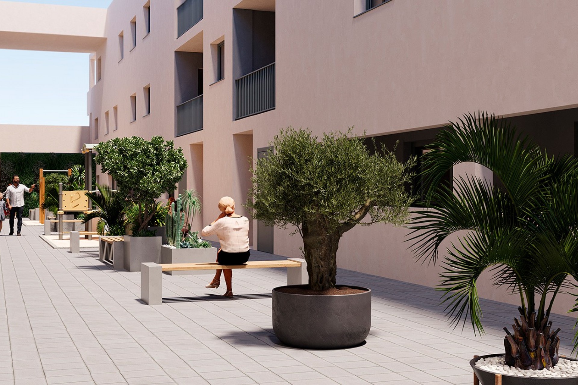 La zona común en planta baja constituye el verdadero corazón social del conjunto residencial. Este espacio ha sido pensado como un punto de encuentro para los residentes, rodeado de cuidados jardines, agradables áreas de descanso, aparcamiento para bicicletas y un parque infantil, creando un entorno ideal tanto para familias como para quienes buscan tranquilidad y calidad de vida.