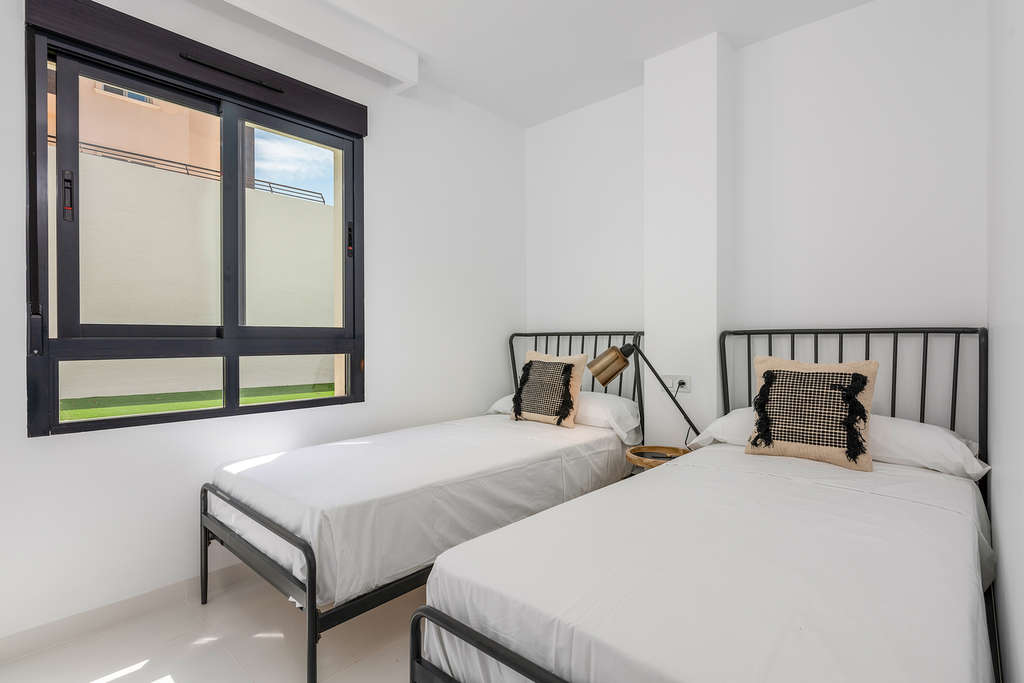 Este precioso apartamento de dos dormitorios en planta baja, con un amplio jardín privado, se encuentra en la codiciada zona de San Miguel de Salinas, a poca distancia a pie de bares, supermercados y restaurantes. La propiedad se vende totalmente amueblada y consta de un luminoso salón-comedor, una cocina americana totalmente equipada, dos dormitorios con armarios empotrados, dos baños con calefacción por suelo radiante y una soleada terraza con un jardín muy amplio. El precio también incluye un trastero y una plaza de aparcamiento en el garaje subterráneo. ¡Disfrute del clima español durante todo el año en un precioso jardín comunitario con piscina! Cerca de todos los servicios y de varias zonas de ocio, como magníficos campos de golf, numerosos centros comerciales y a tan solo 10 minutos de las prístinas playas de arena blanca de Orihuela Costa/Torrevieja y del centro comercial La Zenia Boulevard.