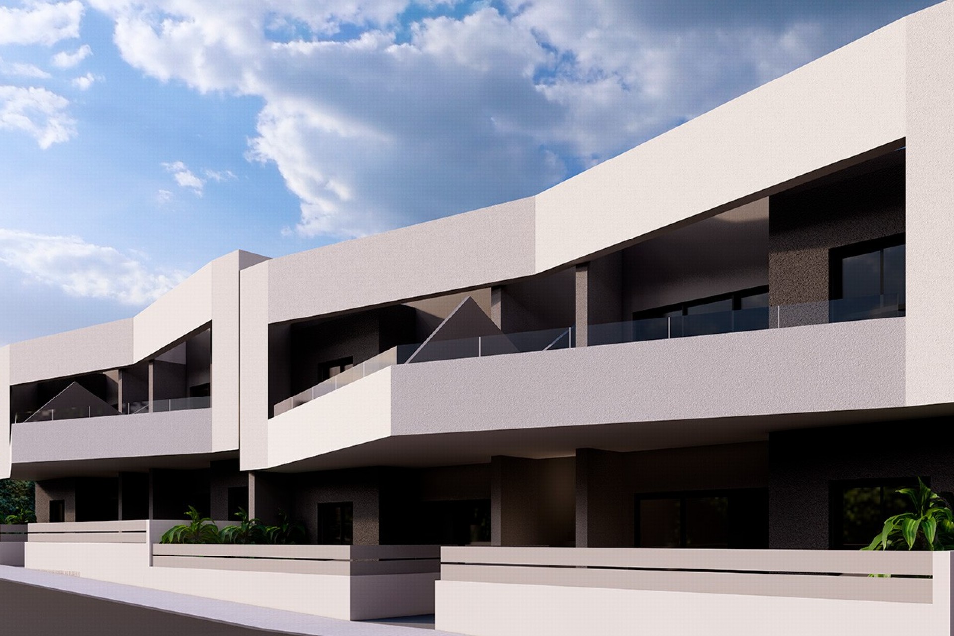 Cimentación con zapatas y vigas de hormigón armado, y estructura unidireccional con pilares y viguetas.Fachadas con doble muro de ladrillo y aislamiento, revestidas en mortero monocapa blanco.Carpintería exterior de aluminio lacado en color antracita con rotura de puente térmico y doble acristalamiento.Persianas en dormitorios y salón, y barandillas con vidrio de seguridad.Suelos porcelánicos de gran formato en toda la vivienda y terrazas, alicatado de calidad en cocina y baños.Cocinas completamente amuebladas con armarios altos y bajos, encimera de melamina, vitrocerámica y campana extractora integrada.Baños con lavabos sobre mueble, grifería monomando e inodoros de primera calidad.Preinstalación de aire acondicionado en salón y dormitorios.Solárium privado en viviendas de planta alta con tomas de agua, luz y TV. Jardines privados en planta baja con cerramiento perimetral.Zonas comunes con dos piscinas comunitarias de más de 140 m² cada una, áreas ajardinadas y zonas infantiles.