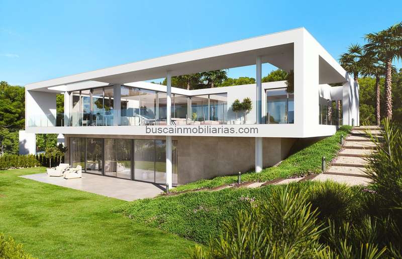 La villa se integra con la arbolada de bosque mediterráneo a través espectaculares terrazas ajardinadas y amplios ventanales que funden el interior de la vivienda con su entorno natural.