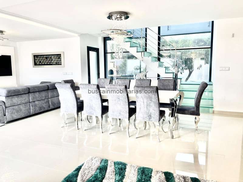 Esta villa de moderna construcción, cuenta con un total de 5 habitaciones y 4 baños, distribuidos en dos plantas y sótano, con un práctico ascensor que comunica con todas las plantas de la casa y una preciosa escalera de cristal con luz interior. Salón comedor con cocina de concepto abierto e isla central, habitación principal con baño en suite. En planta sótano, salón de juegos, sala para celebraciones y sala de cine.