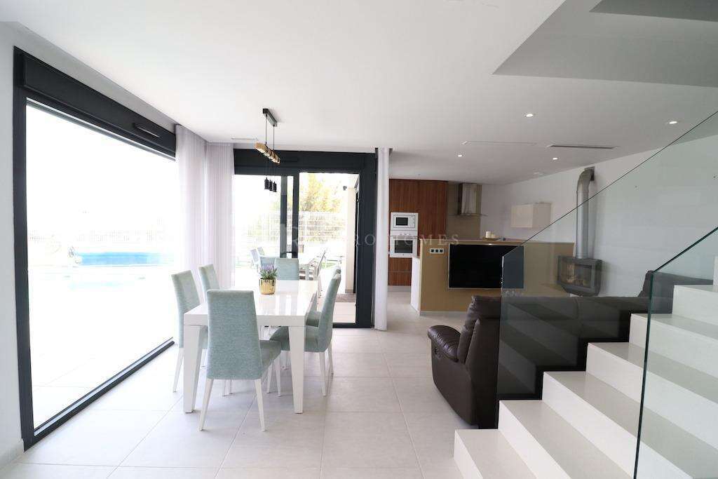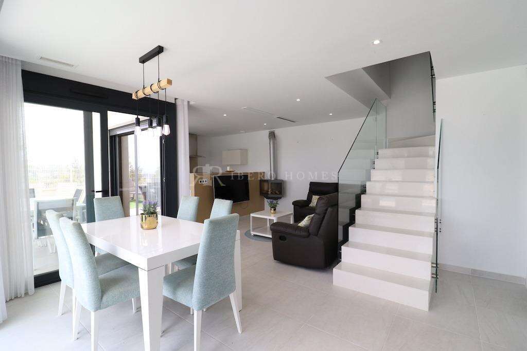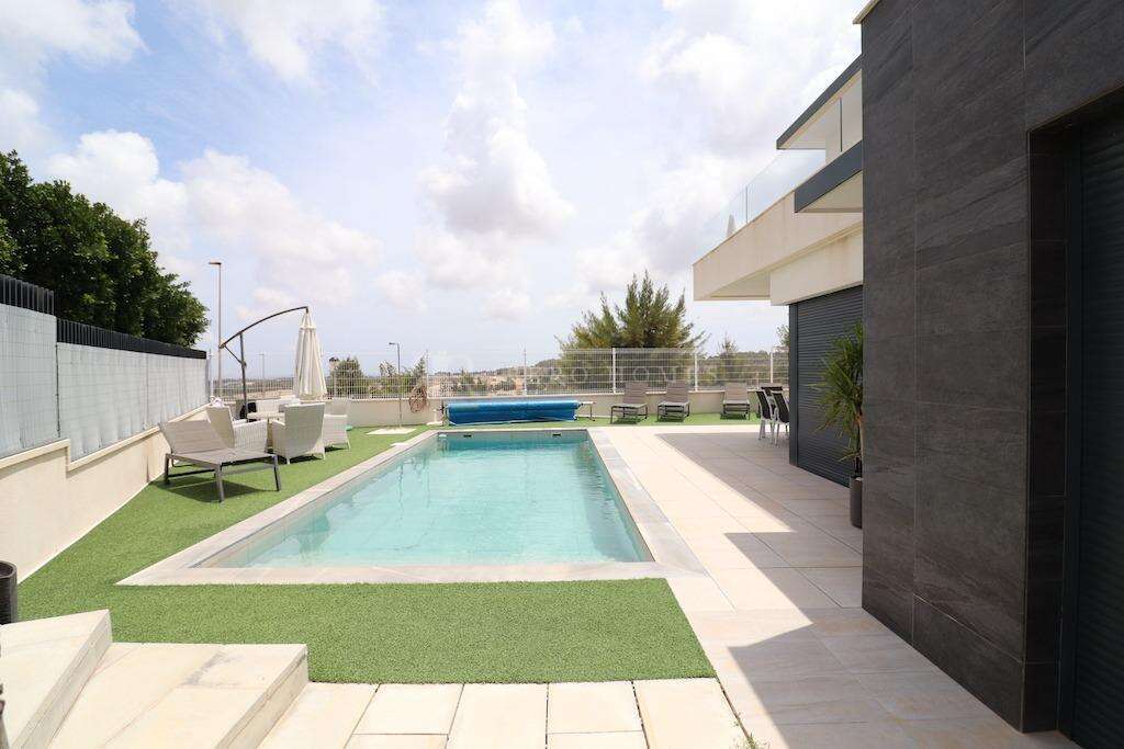 Villa independiente en esquina frente a un parque, con una parcela de 310 m2 y una vivienda en dos plantas de 125 m2.~~La vivienda dispone de 3 dormitorios (1 de ellos en planta baja) y 3 baños, cocina abierta al salón comedor con isla, terraza, solárium con vistas al mar y a las salinas de Torrevieja, bonita piscina privada, y entrada para coche.~~Se vende amueblada y con aire acondicionado. Año de construcción 2019.~~Ubicada en el Mirador de San Miguel.~