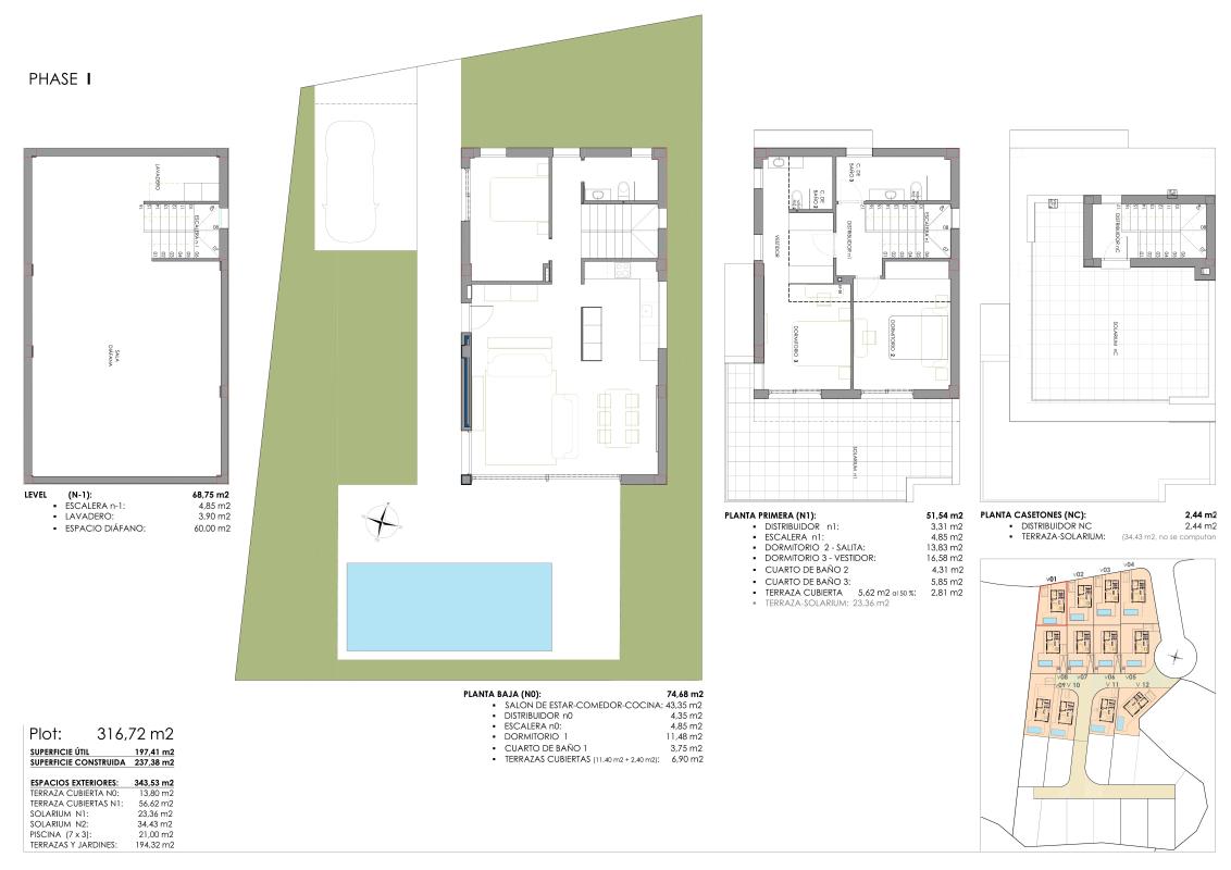 Cada villa ofrece un diseño estándar con una superficie de 339 m², distribuidos en tres niveles, con parcelas que van de 304 m² a 357 m². En la planta baja, disfrutarás de un amplio salón con cocina americana, un dormitorio principal con armario empotrado y un baño completo. Tanto el salón como el dormitorio tienen acceso directo al jardín y a una espléndida piscina.