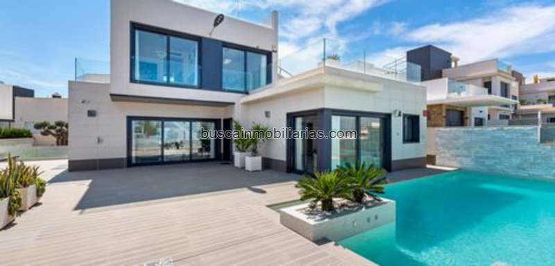 Villa de lujo con 5 habitaciones e increíbles vistas Esta propiedad de lujo de reciente construcción cuenta con un total de 5 habitaciones y 4 baños, distribuidos en dos plantas y sótano, con un práctico ascensor que comunica con todas las plantas de la casa y una preciosa escalera de cristal con luz interior. En la planta sótano encontramos un salón de juegos (con billar y futbolín), un salón para celebraciones con una cocina completa, 2 habitaciones, 2 cuartos de almacenaje y un baño completo. En la planta principal encontramos el salón comedor con cocina de concepto abierto e isla central, la habitación principal con baño en suite, así como el cuarto destinado a lavandería y un aseo. En la primera planta se ubican 2 habitaciones amplias, 2 cuartos de baño y los accesos a los balcones. En la última planta encontramos un increíble solarium de unos 70m2 con impresionantes vistas panorámicas. Equipamiento Dispone de aire condicionado, parking propio para varios vehículos, calefacción central con suelo radiante en toda la casa y se encuentra a la venta amueblada con muebles de diseño y equipada, salvo efectos personales. La vivienda cuenta también con una máquina de pelet para calentar la vivienda, así como placas solares y termo eléctrico. La vivienda incluye ventanas y puertas de seguridad, con llaves con clave, así como un sistema de seguridad con sensores en todas las estancias. El equipamiento es de alta calidad, incluyendo: sofás motorizados, colchones a estrenar, horno a vapor con pirólisis, nevera combo que fabrica hielo normal y picado. ExteriorEn el jardín encontramos una piscina privada con cascada, jacuzzi e hidromasaje. El espacio alrededor de la piscina está muy cuidado, decorado con una gran cantidad de vegetación. Junto a la piscina encontramos una ducha exterior. Por último, también hay aparcamiento para varios coches dentro de la parcela.AreaResidencial Bellavista se sitúa en una de las zonas con mejores vistas de la Costa Blanca. En el término municipal de San Miguel de Salinas, a tan solo 7 kilómetros de las playas de Orihuela, rodeado de campos de golf, el centro comercial más importante de la zona que cuenta con todo tipo de servicios, así como bares, restaurantes, tiendas de ropa, supermercados, etc. Este residencial es ideal para los amantes de la naturaleza y la tranquilidad.