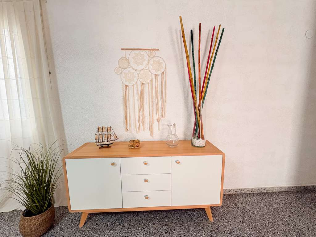 El apartamento cuenta con 3 habitaciones, 1 baño con ducha, una cocina independiente y un salón muy amplio, ideal para familias o para quienes buscan una propiedad con espacio y distribución cómoda. El elemento más destacado es su terraza con orientación suroeste, que recorre toda la fachada del apartamento, proporcionando luz natural durante todo el día y un espacio exterior perfecto para disfrutar del clima mediterráneo.
