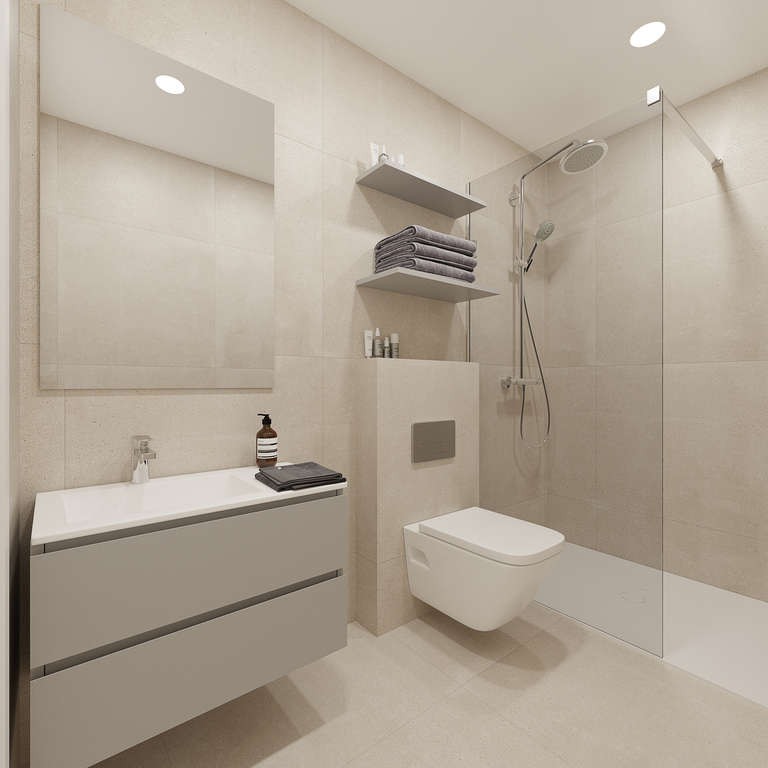 En el interior, las viviendas están diseñadas para ofrecer un espacio acogedor y funcional. Los apartamentos y áticos disponen de 2 o 3 dormitorios y 2 baños, adaptándose a diferentes necesidades familiares. La distribución incluye amplias terrazas, perfectas para disfrutar de las vistas y del clima templado de la región. Los acabados de calidad, como los suelos de cerámica y los armarios empotrados, aseguran un ambiente moderno y práctico, mientras que la posibilidad de contar con un solárium en algunas tipologías añade un valor adicional a la experiencia de vivir aquí.