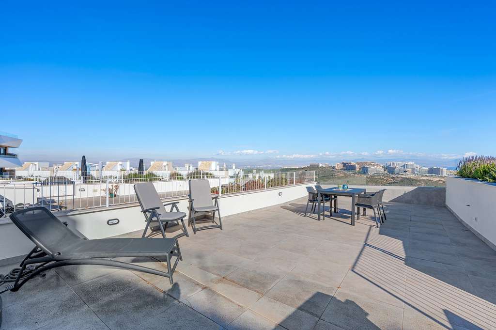 Una excepcional casa moderna en Gran Alacant, finalizada en 2023 y ubicada en una zona elevada de la zona, ofrece vistas panorámicas panorámicas al mar Mediterráneo. Esta residencia combina un diseño contemporáneo con una de las ubicaciones más codiciadas de la Costa Blanca, lo que la convierte en la opción ideal para quienes buscan un apartamento elegante con espectaculares vistas al mar y excelente proximidad a playas, servicios y transporte. En su interior, la propiedad cuenta con un total de 86 m² de espacio habitable bien diseñado. Dispone de tres amplios dormitorios, cada uno con armarios empotrados para un cómodo almacenamiento, y dos modernos baños con acabados de alta calidad. El salón-comedor de planta abierta disfruta de una gran cantidad de luz natural gracias a sus amplios ventanales, creando un ambiente luminoso y espacioso, a la vez que maximiza el impresionante paisaje exterior. Desde aquí, se accede a una terraza y un balcón privados que amplían el espacio habitable al exterior. La propiedad se entrega amueblada. Un punto destacado de la casa es la impresionante terraza en la azotea, donde podrá disfrutar de la luz del sol desde la mañana hasta la noche. Este amplio espacio es perfecto para relajarse, organizar cenas o disfrutar de momentos sociales con algunas de las mejores vistas al mar de Gran Alacant. La propiedad también incluye un trastero privado y una plaza de aparcamiento, lo que garantiza una vida cómoda a diario. El edificio se encuentra en la primera planta y cuenta con ascensor para facilitar el acceso. En la zona comunitaria, los residentes pueden disfrutar de una piscina de hermoso diseño para niños y adultos y jardines paisajísticos, ideales tanto para la diversión familiar como para disfrutar de tranquilos días junto al agua. La zona común también cuenta con una zona de juegos para niños, una zona de barbacoa y un gimnasio. La ubicación de este apartamento es uno de sus puntos fuertes. Gran Alacant es conocido por su impresionante costa, sus parques naturales y su relajado estilo de vida mediterráneo. La propiedad se encuentra a pocos minutos de la famosa playa del Carabassi, reconocida por sus dunas de arena fina y aguas cristalinas. Encontrará supermercados, restaurantes, cafeterías y servicios esenciales cerca, así como excelentes conexiones de transporte público con la ciudad de Alicante, Santa Pola y el aeropuerto de Alicante. Esto convierte al apartamento no solo en una maravillosa casa de vacaciones, sino también en una práctica residencia permanente con potencial para alquiler. Su ubicación elevada garantiza vistas abiertas al mar, a la vez que se encuentra cerca de todo lo que Gran Alacant ofrece, desde rutas de senderismo y ciclismo hasta deportes acuáticos y vibrantes mercados locales. Esta es una oportunidad única para mudarse a una casa contemporánea en una de las mejores ubicaciones de Gran Alacant, que combina comodidad, estilo e impresionantes vistas al mar. Características básicas: Esta propiedad ofrece 86 m² de espacio interior con tres dormitorios, dos baños, armarios empotrados, azotea y balcón, aire acondicionado, trastero privado y plaza de aparcamiento incluida en el precio. El apartamento es de segunda mano, pero está en excelentes condiciones y fue construido en 2023. Está ubicado en la primera planta de un edificio exterior con ascensor para facilitar el acceso. Servicios: Los residentes disfrutan de acceso a una piscina comunitaria y zonas ajardinadas, lo que proporciona un ambiente tranquilo y atractivo para relajarse. ¡Contáctenos para más información y una visita privada!