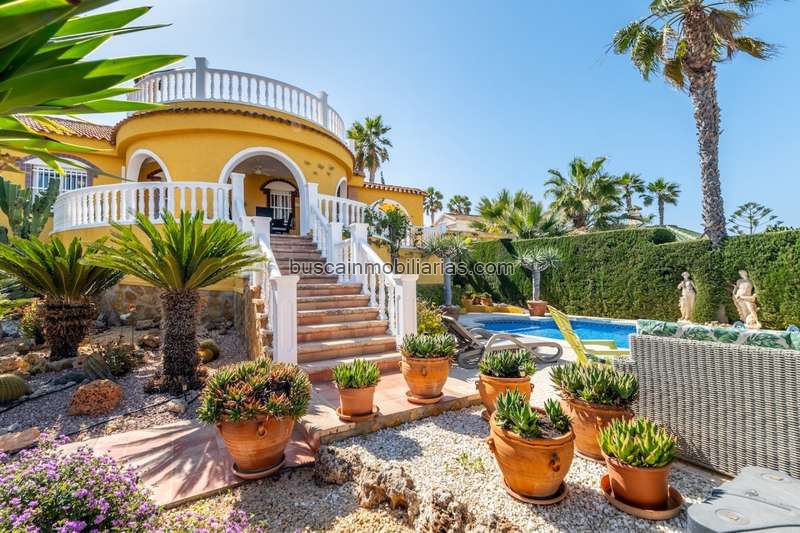 Una escalera exterior conduce a la planta superior. Allí encontrarás un dormitorio doble, otro baño y un solárium de 40 m² con vistas a Gran Alacant, las montañas y la ciudad de Alicante.