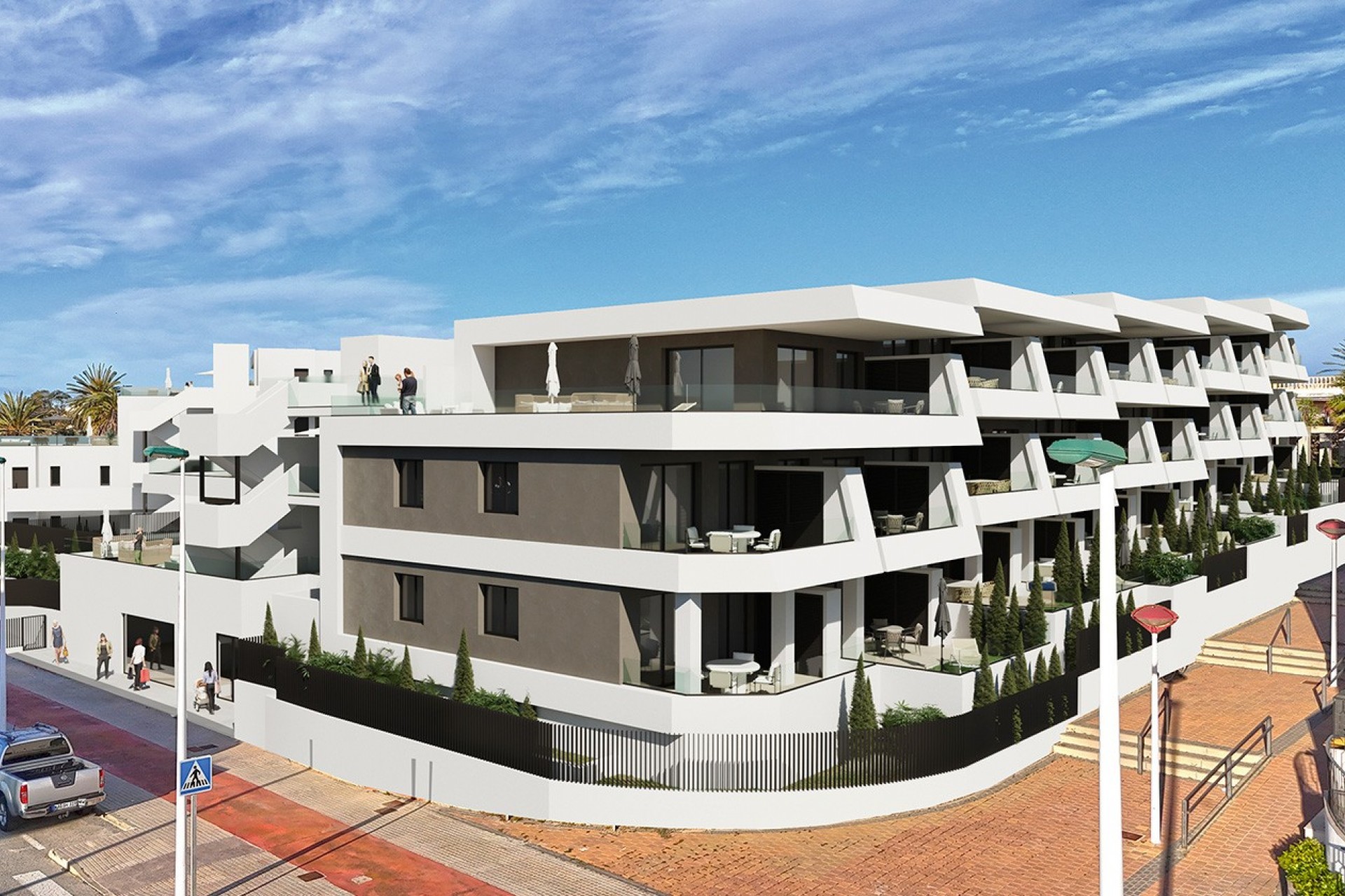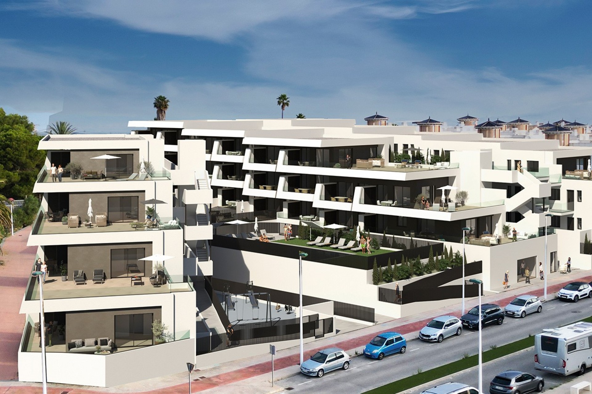 Las viviendas se entregan totalmente amuebladas, con electrodomésticos y sistema de iluminación incluidos, lo que permite disfrutar de un hogar listo para entrar a vivir desde el primer día. Además, cada unidad incorpora plaza de aparcamiento subterráneo y un gran trastero, aportando comodidad y espacio adicional. La urbanización ofrece también una elegante piscina comunitaria, pensada para complementar el estilo de vida relajado y mediterráneo que caracteriza esta ubicación.
