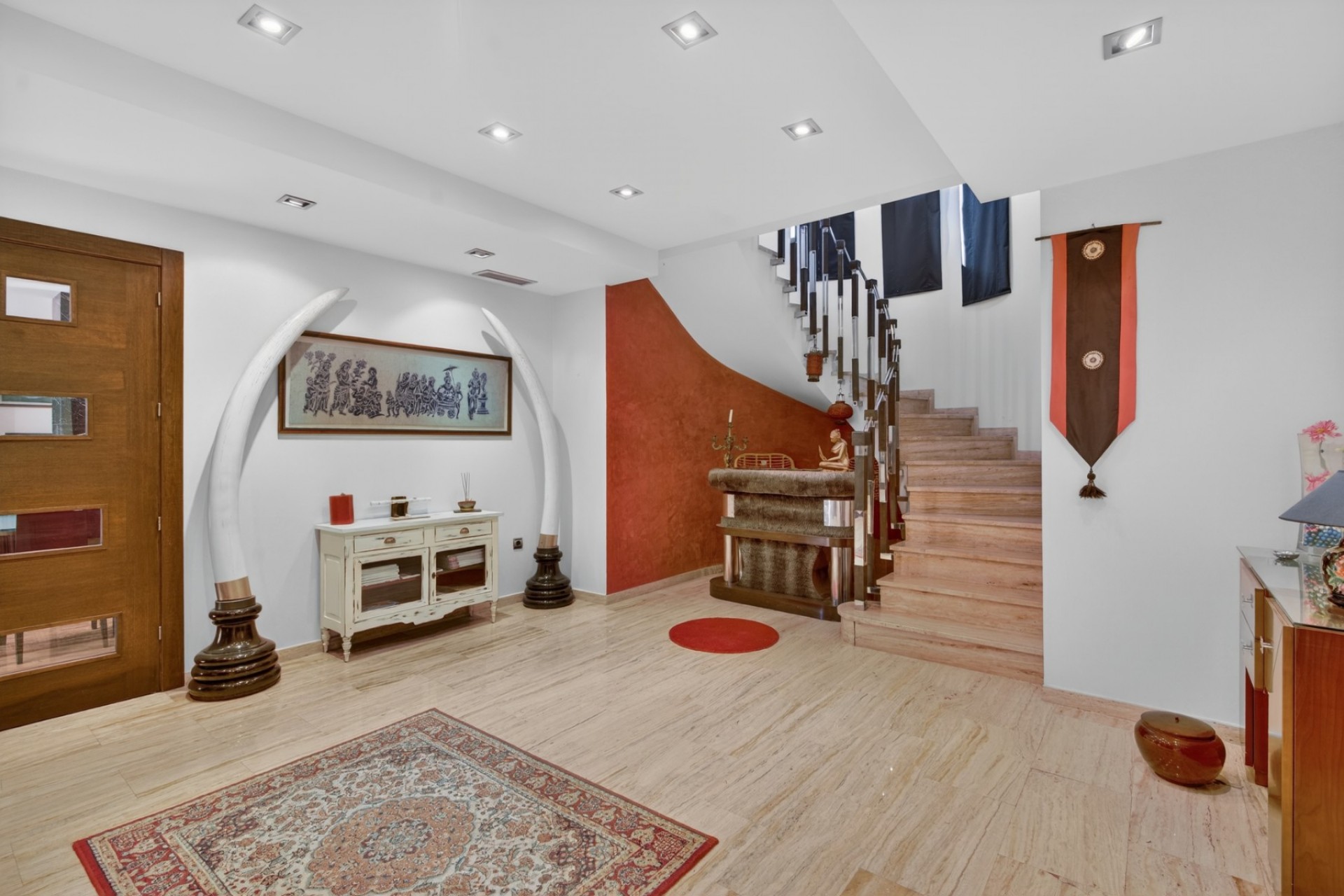 La entrada a la vivienda se realiza a través de un amplio porche cubierto con diferentes ambientes para sentarse y relajarse. Desde aquí se accede a un elegante recibidor que distribuye las distintas estancias de la casa.
