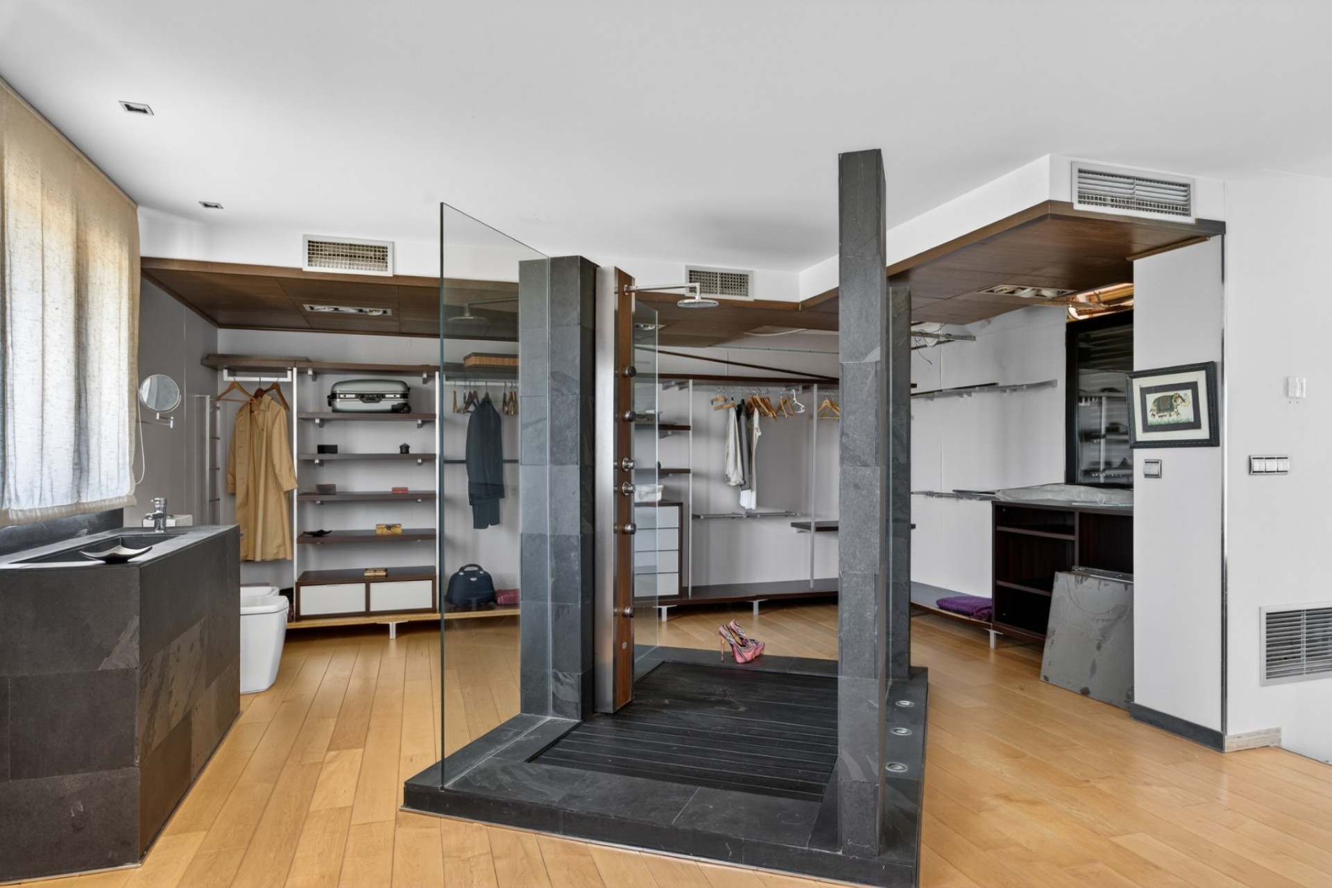 Amplia estancia diáfana que actualmente combina zona de descanso y área de trabajo. Incluye vestidor y un baño abierto con bañera. Desde aquí se accede directamente a una gran terraza tipo solárium, con excelente orientación y sol durante todo el día.