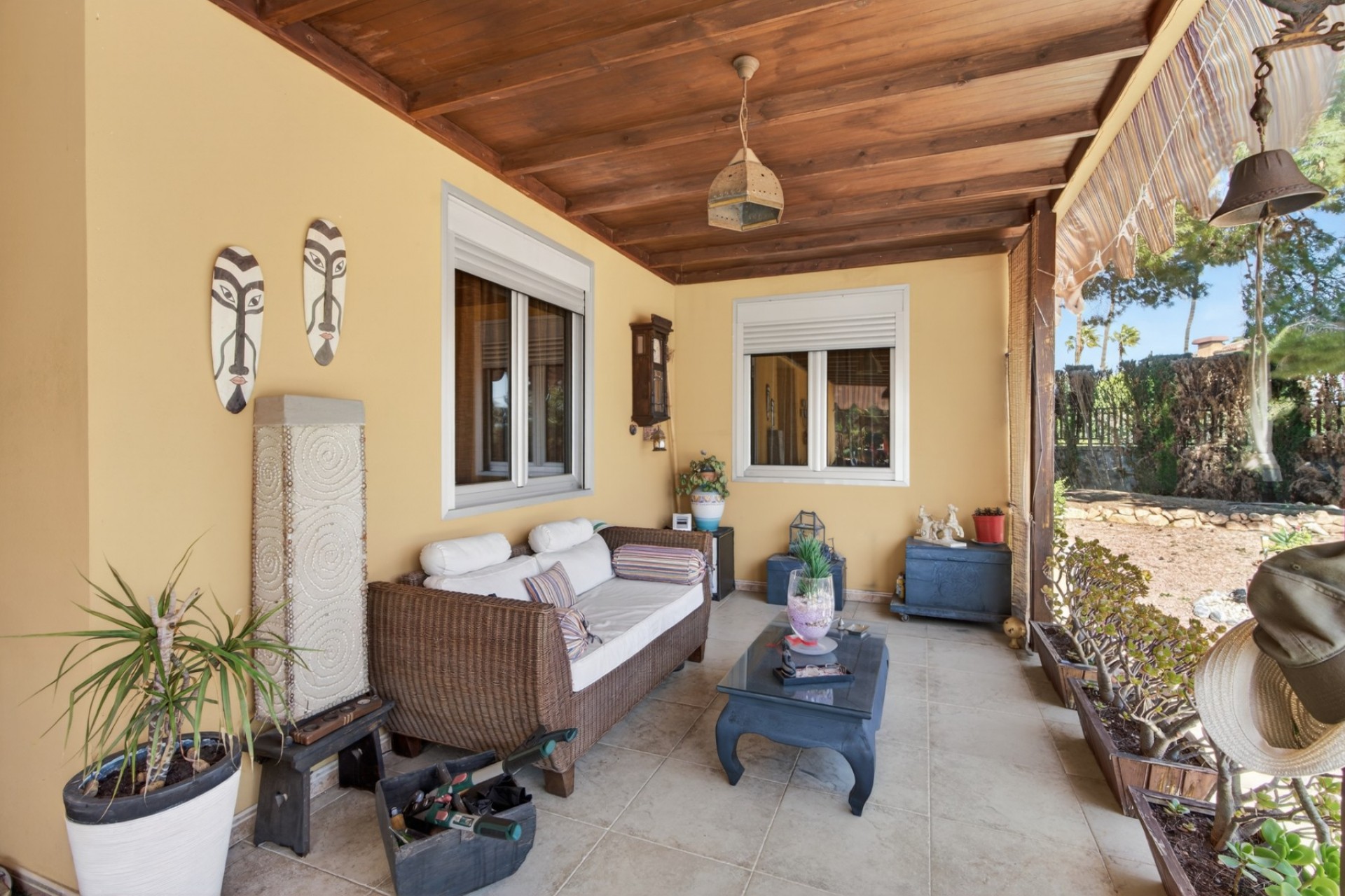 La finca, de aproximadamente 6.000 m², presenta un cuidado diseño ajardinado con vegetación madura, palmeras y distintos espacios exteriores pensados para el descanso. Existen varias áreas tipo chill-out y suficiente espacio para construir una piscina si se desea.