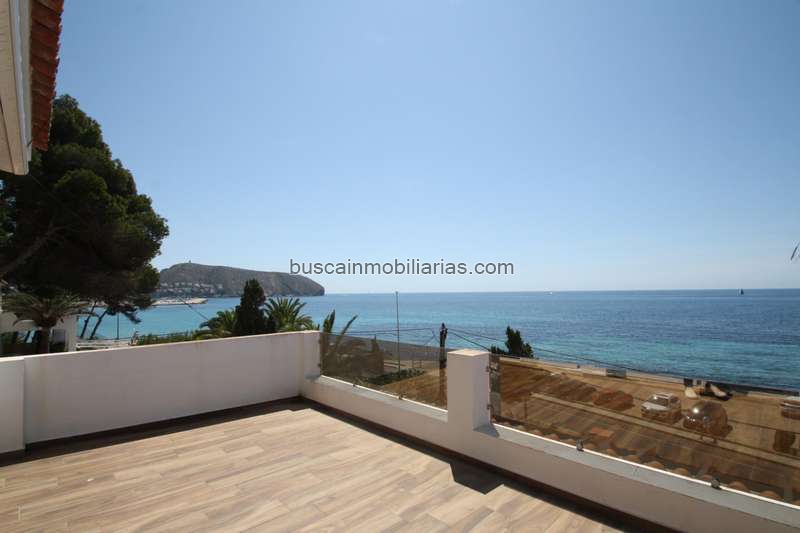 ▷Este apartamento reformado con estilo, ubicado en la tercera planta, se encuentra en una ubicación privilegiada, justo en primera línea del mar y la playa en Moraira. El amplio balcón principal ofrece vistas despejadas al mar Mediterráneo y al emblemático Peñón de Ifach.