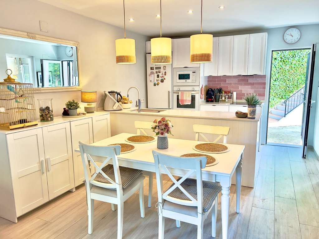 En el exterior, la amplia terraza invita a disfrutar de la vida al aire libre, con espacio suficiente para comer y relajarse. Un encantador jardín de grava ofrece vegetación de fácil mantenimiento, con setos y plantas mediterráneas que aportan color y privacidad. La entrada trasera desde esta zona proporciona un acceso alternativo y práctico a la propiedad.