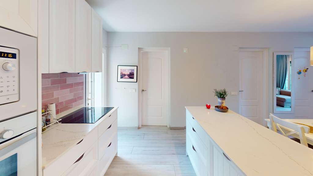 Este encantador apartamento de fácil mantenimiento le da la bienvenida a un acogedor espacio diáfano que combina salón, comedor y una cocina totalmente equipada. La cocina cuenta con placa de inducción, horno independiente empotrado, microondas, frigorífico-congelador de gran capacidad y lavavajillas integrado. Una amplia encimera con fregadero integrado ofrece mucho espacio para preparar la cena. Los armarios extraíbles y los elegantes muebles blancos crean un ambiente cálido y acogedor.