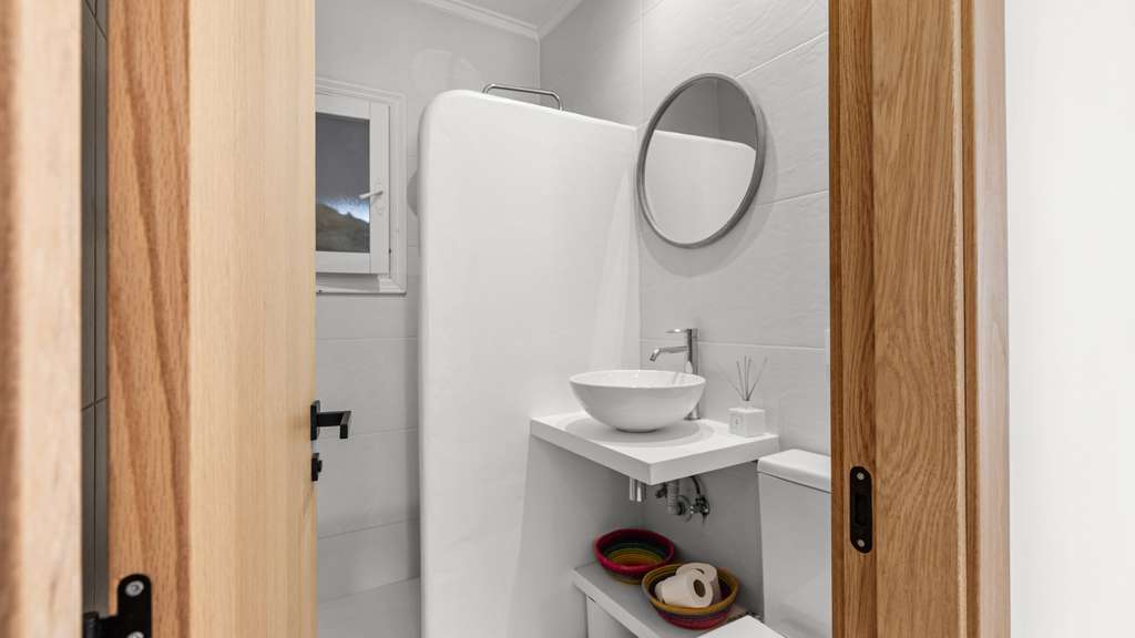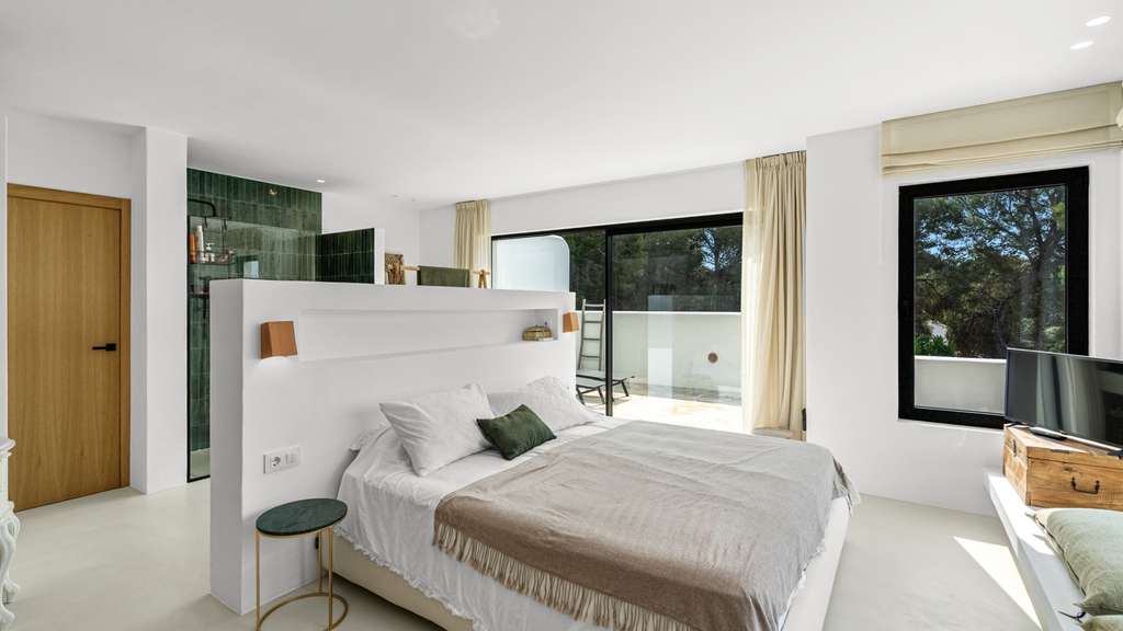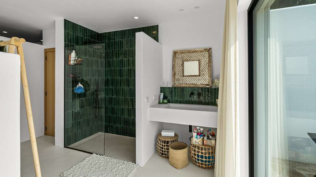 La villa dispone de cuatro amplios dormitorios y tres baños refinados, incluyendo una suite principal con un detalle único: vistas al mar incluso desde la ducha – un lujo diario.