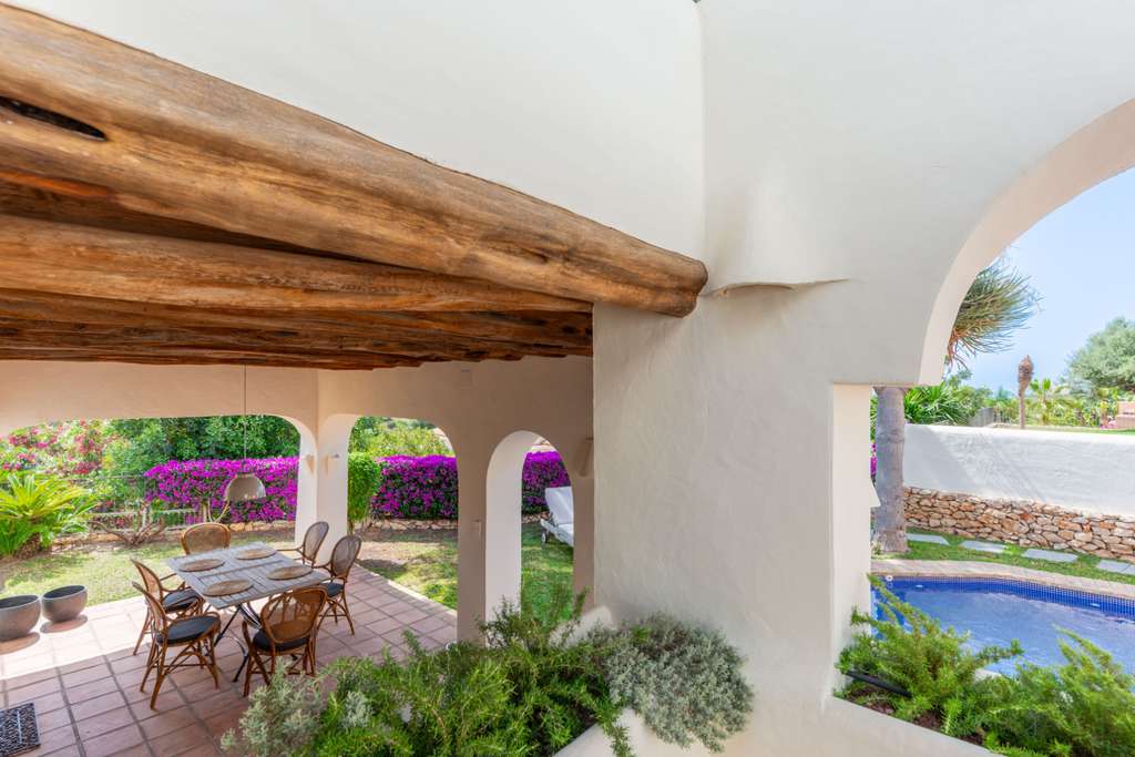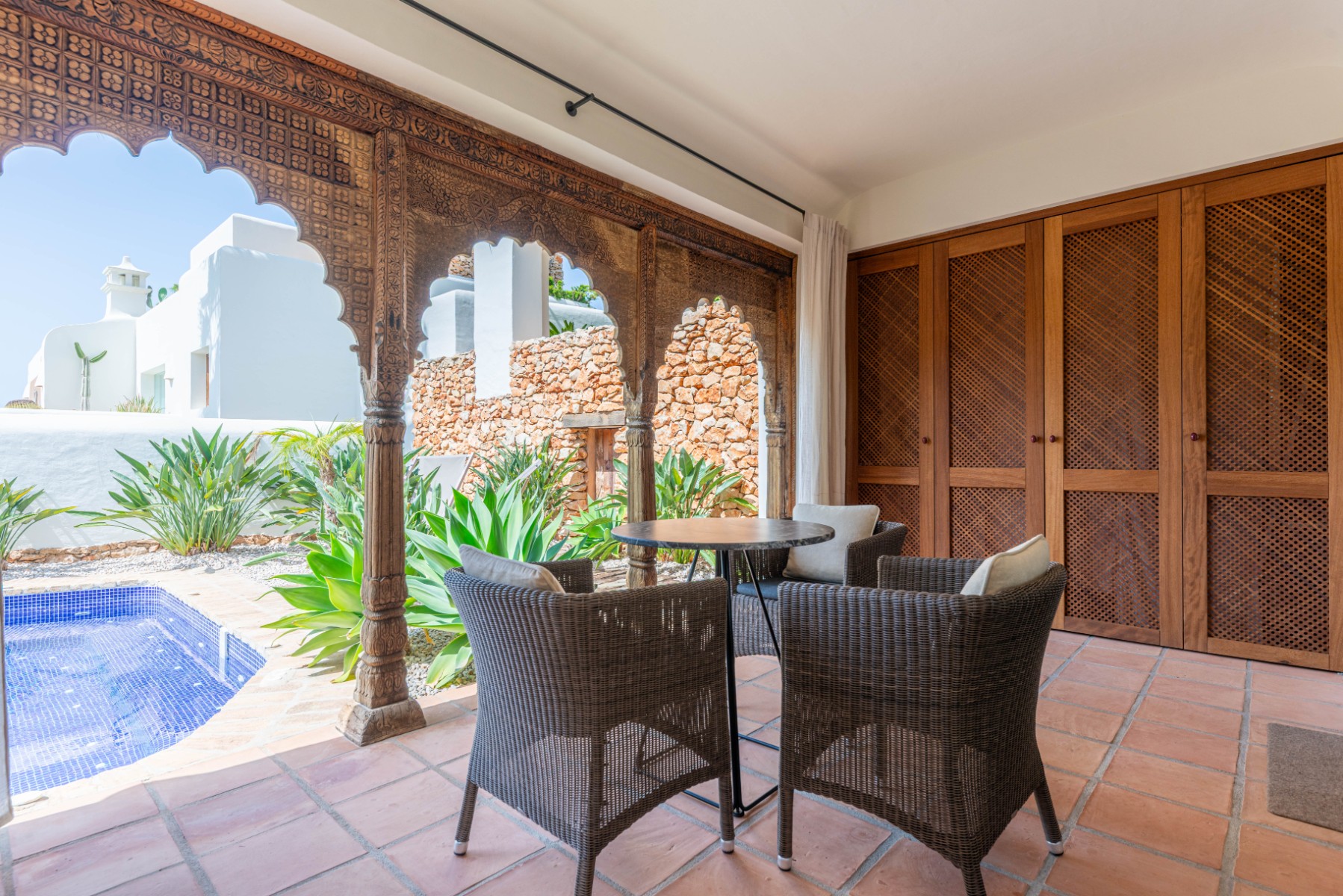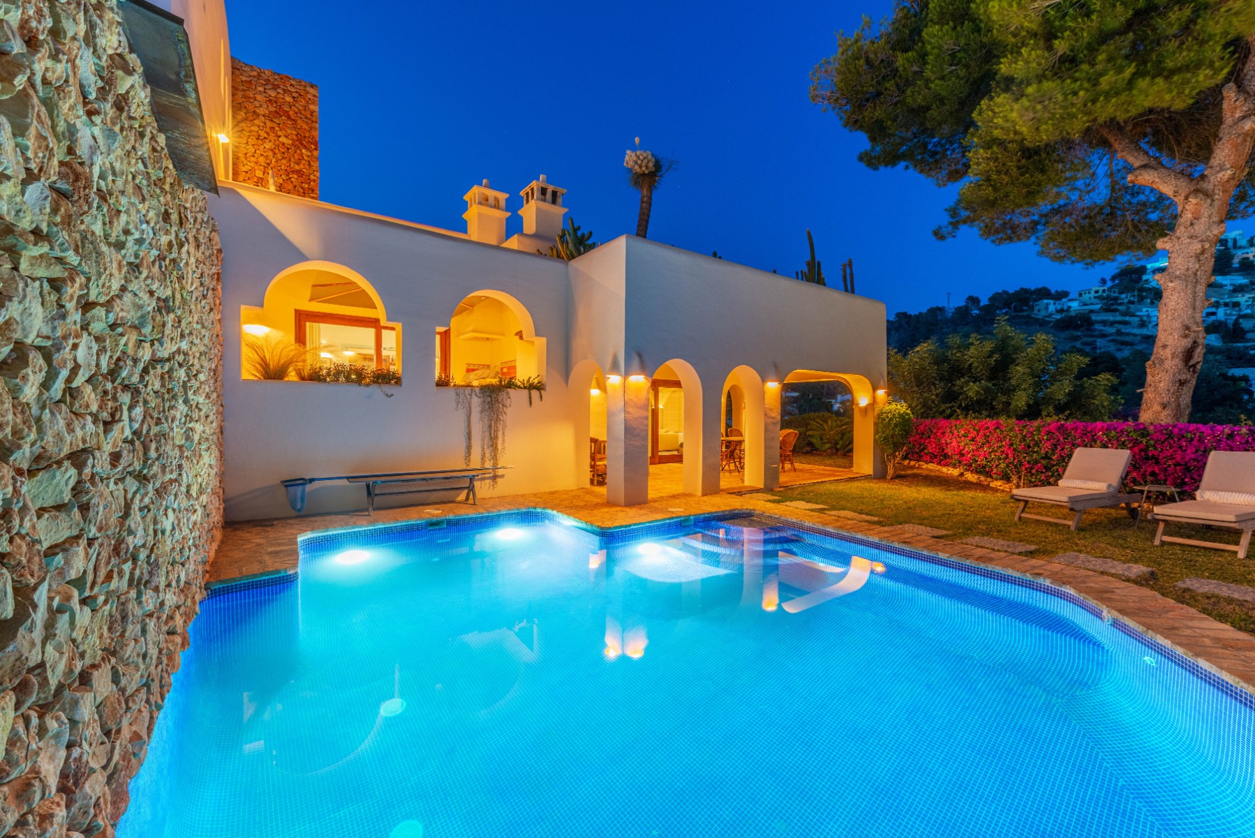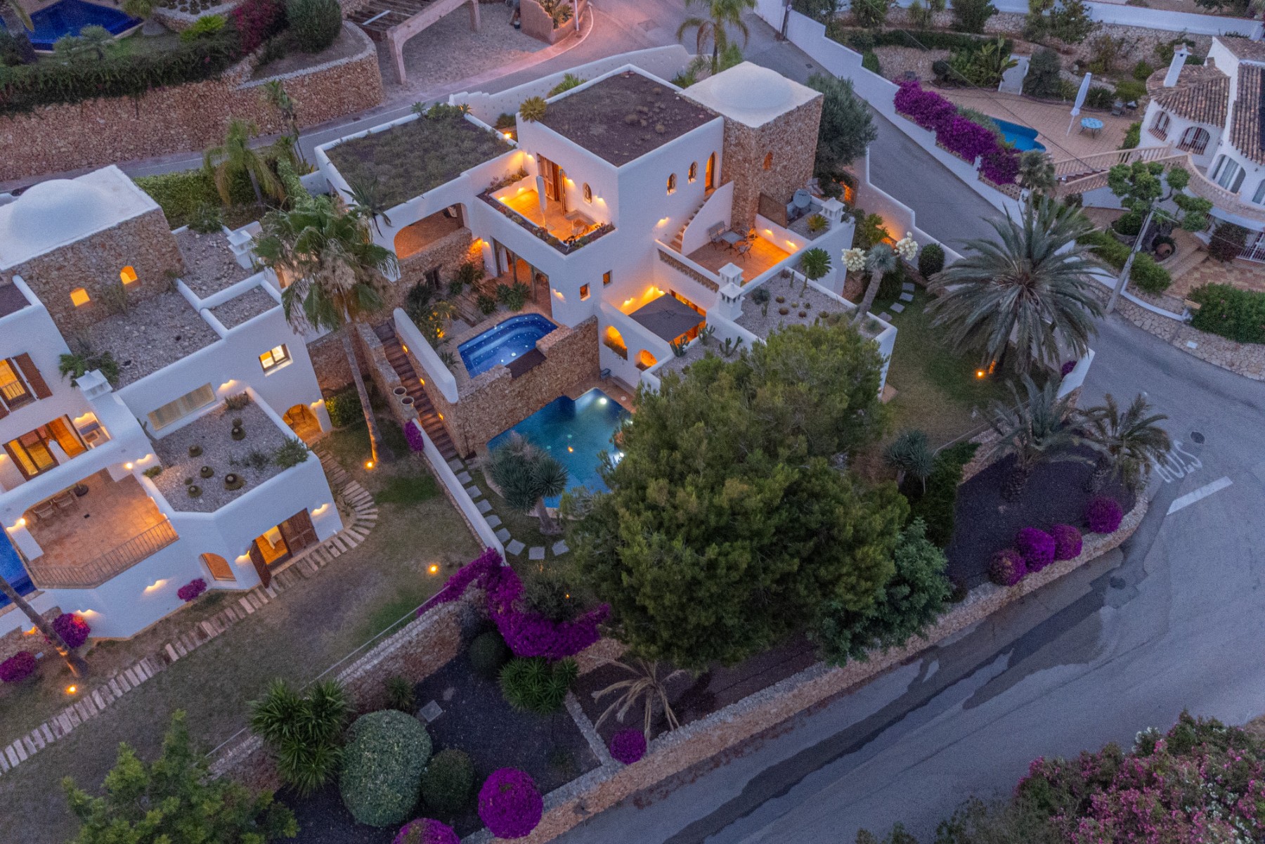 Accedemos al recibidor con servicio de cortesía y encontramos un amplio salón con dos porches con vistas al mar, que bordean la piscina, el jacuzzi en la misma planta y el jardín. Desde el salón, accedemos a un amplio comedor y cocina con lavadero. En la planta superior se encuentra el dormitorio principal con baño y vestidor. También encontramos en esta planta una amplia terraza con preciosas vistas al mar y a la montaña. En la planta inferior, encontramos dos dormitorios y un amplio baño. Es posible añadir un segundo baño. Una preciosa bodega y un cuarto técnico.