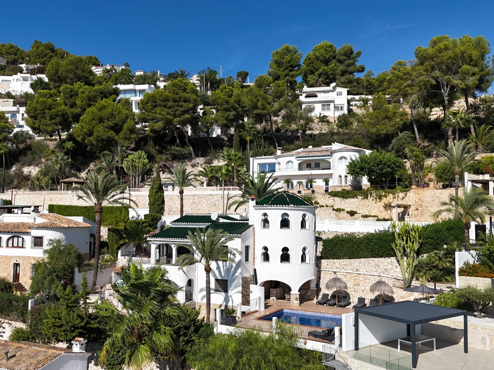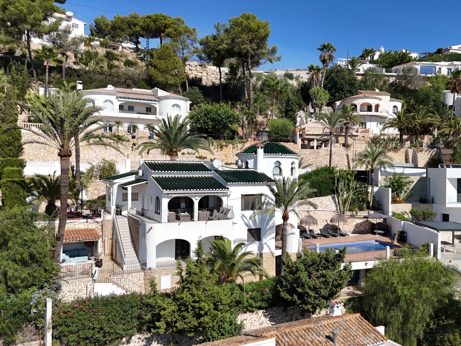Amplia y precioso vivienda en el popular barrio de Benimeit, con amplias vistas tanto a la vegetación y al centro de Moraira como al azul brillante del mar Mediterráneo. Destacan las ventanas de estilo árabe y las tejas verdes, que le dan a la villa un aspecto único. Además, cuenta con dos plantas, varias terrazas, una gran terraza con piscina y un agradable salón/bar cubierto contiguo, con magníficas vistas al mar desde todas las estancias. La vivienda también dispone de un lavadero independiente y un amplio trastero.