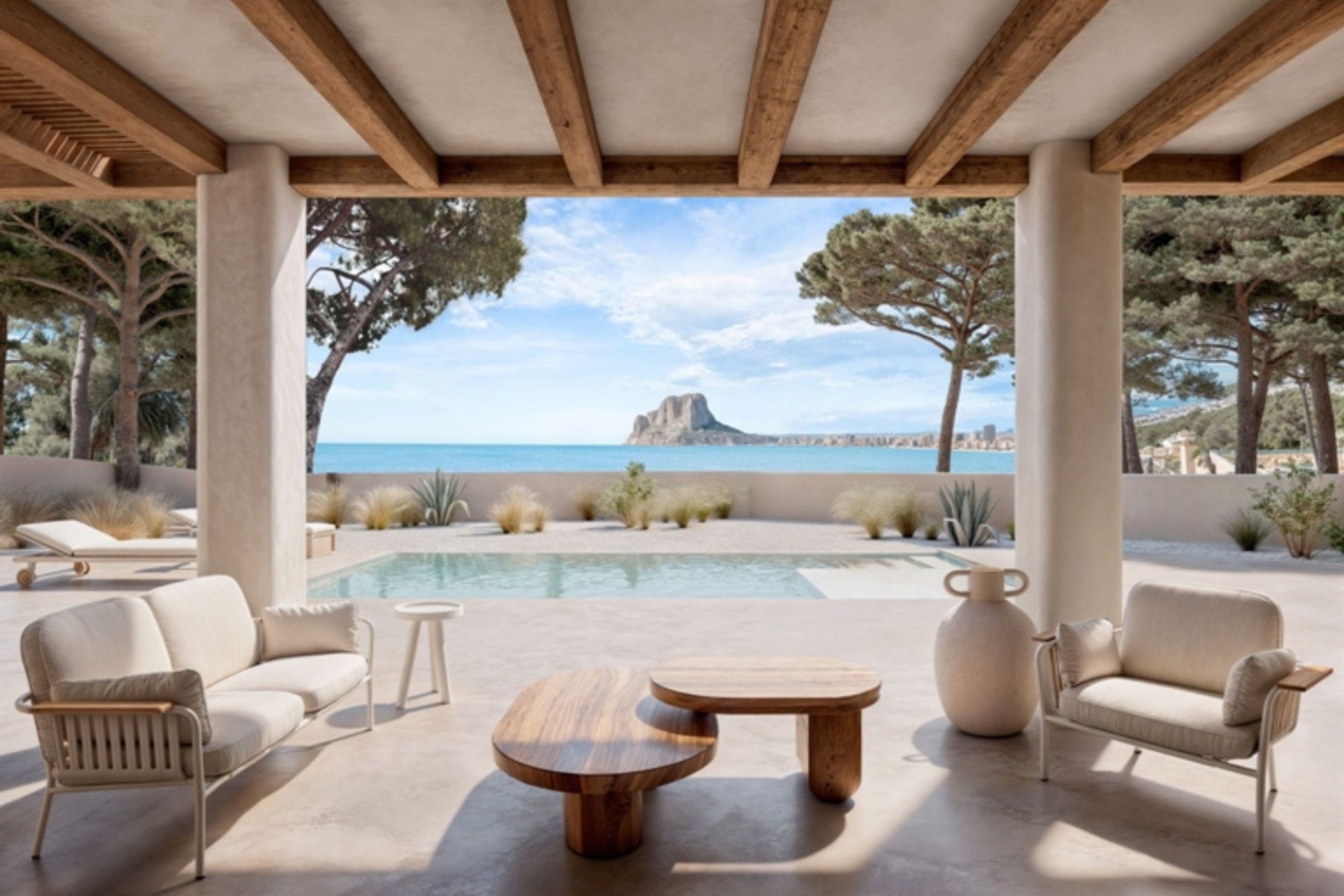 La planta baja consta de una amplia zona de estar abierta con una cocina de diseño totalmente equipada con isla central y adyacente un práctico lavadero, un luminoso comedor y una acogedora sala de estar. Desde la cocina y el salón se accede directamente al porche cubierto, la piscina privada y la terraza con vistas panorámicas al mar. También en esta planta hay un aseo de invitados, dos amplios dormitorios y un moderno cuarto de baño.