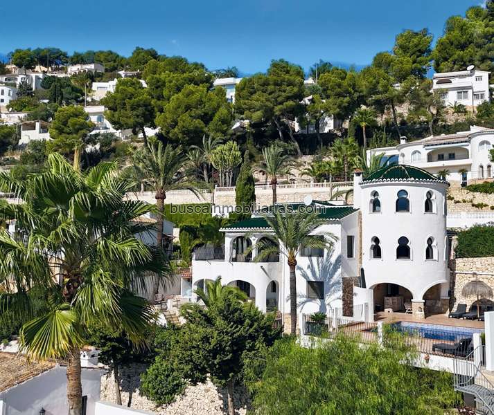 Amplia y precioso vivienda en el popular barrio de Benimeit, con amplias vistas tanto a la vegetación y al centro de Moraira como al azul brillante del mar Mediterráneo. Destacan las ventanas de estilo árabe y las tejas verdes, que le dan a la villa un aspecto único. Además, cuenta con dos plantas, varias terrazas, una gran terraza con piscina y un agradable salón/bar cubierto contiguo, con magníficas vistas al mar desde todas las estancias. La vivienda también dispone de un lavadero independiente y un amplio trastero.