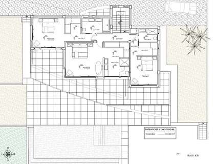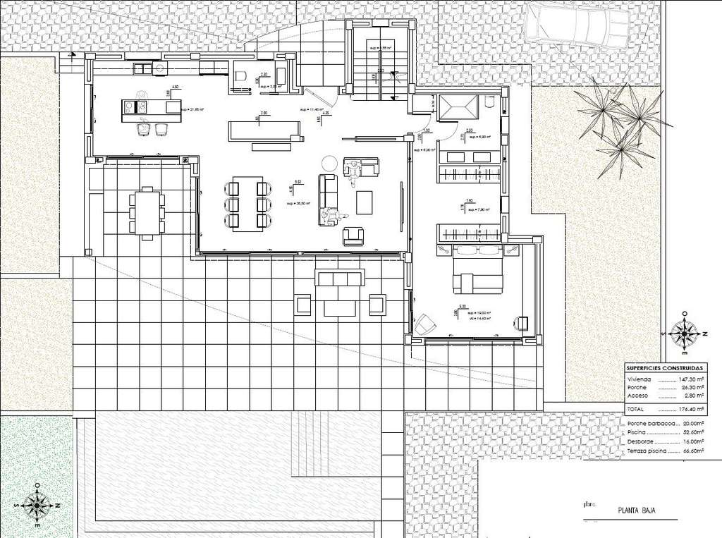 Esta villa de lujo se distribuye en 3 plantas: en la planta baja (147,30m2) se encuentra un amplio y luminoso salón junto a la cocina abierta con isla para cocinar, un aseo de invitados y un dormitorio con baño en suite. En el exterior de esta planta encontramos la piscina y la zona de barbacoa.