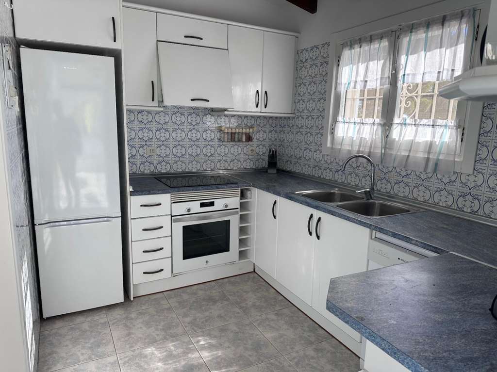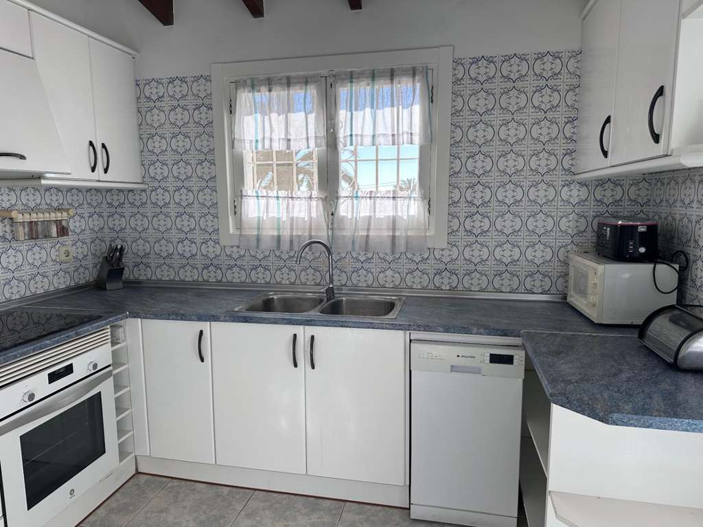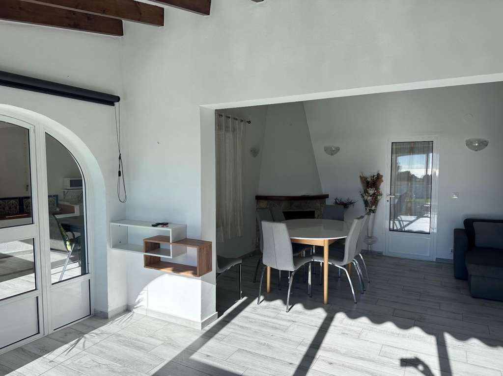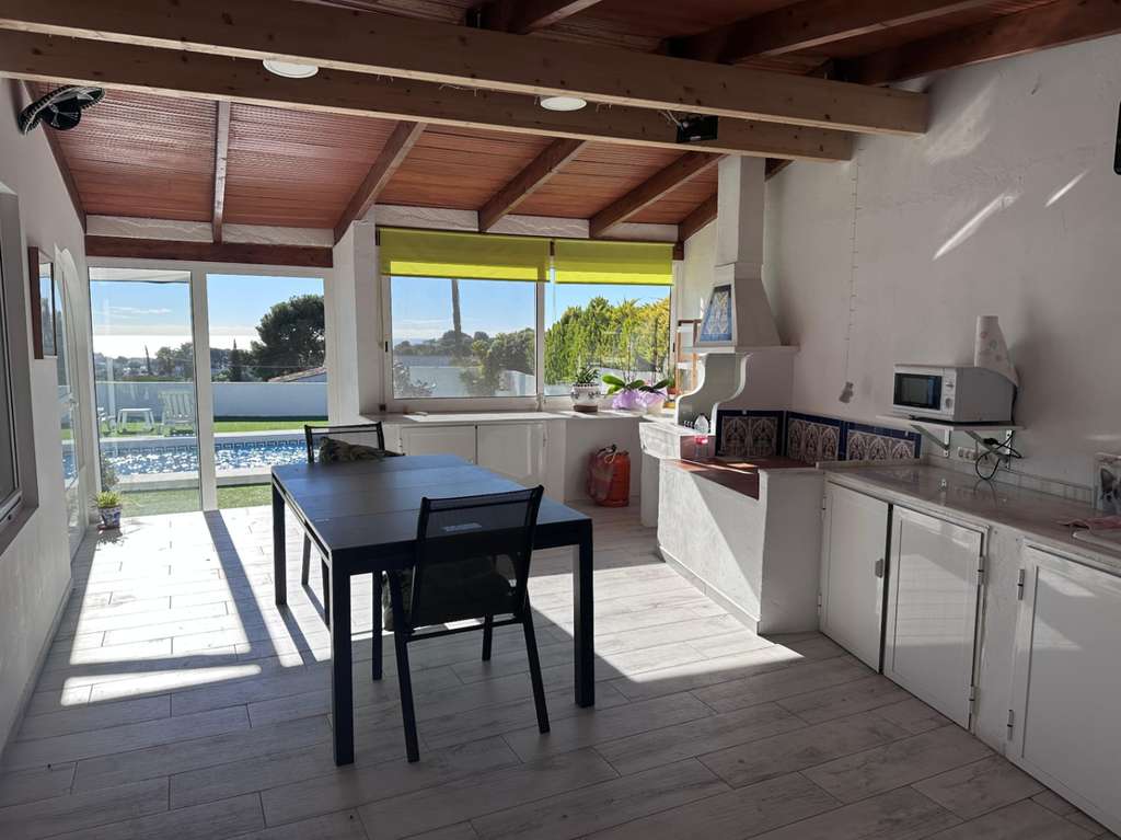 La villa tiene una superficie construida de aproximadamente 180 m² y es totalmente de una sola planta. El salón-comedor con chimenea es luminoso y conecta directamente con la terraza cubierta y la terraza de la piscina. La cocina independiente es funcional y dispone de suficiente espacio de almacenamiento. La vivienda cuenta con tres dormitorios, un cuarto de baño con ducha y un aseo independiente para invitados. Además, hay un lavadero.