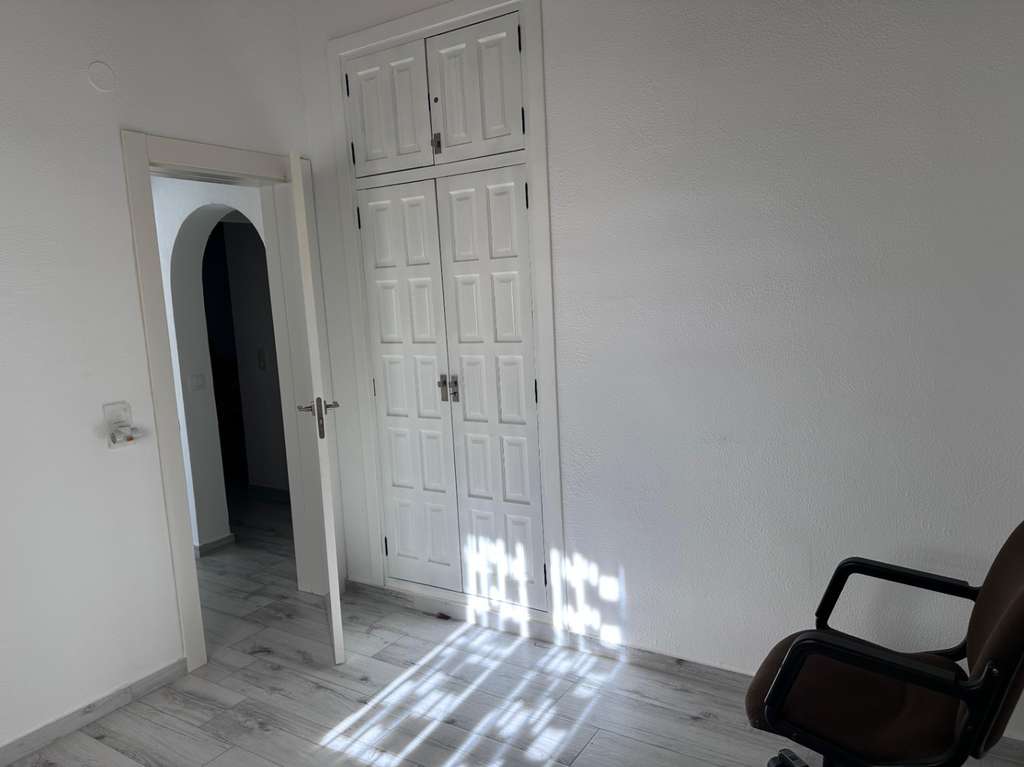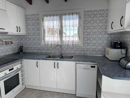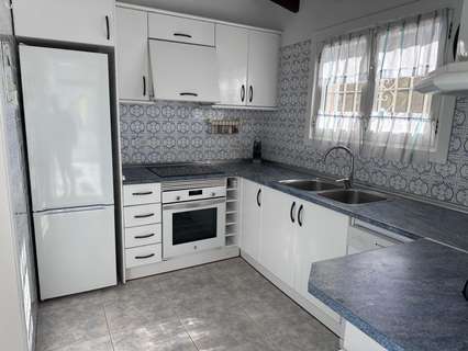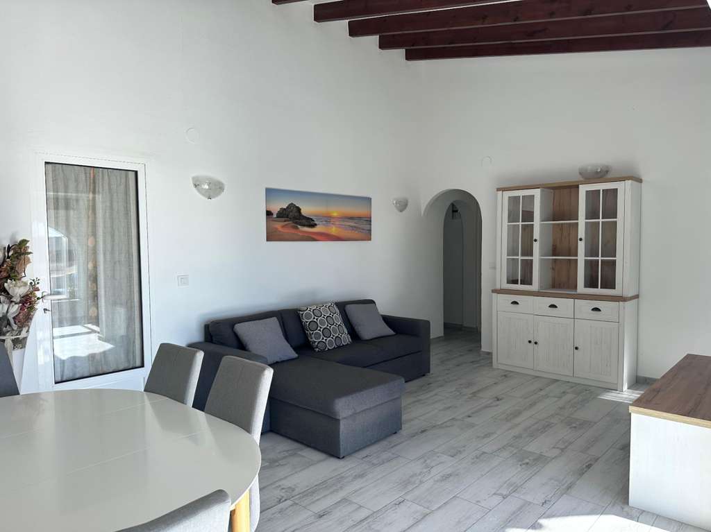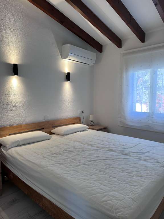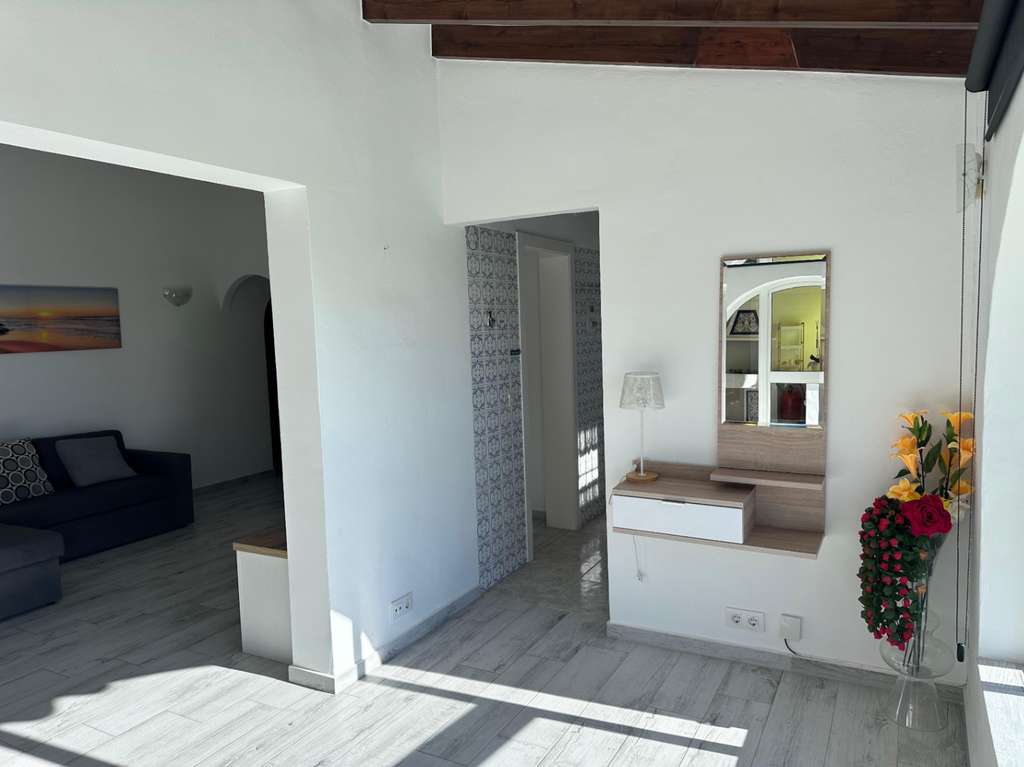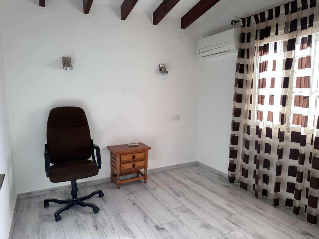 La villa tiene una superficie construida de aproximadamente 180 m² y es totalmente de una sola planta. El salón-comedor con chimenea es luminoso y conecta directamente con la terraza cubierta y la terraza de la piscina. La cocina independiente es funcional y dispone de suficiente espacio de almacenamiento. La vivienda cuenta con tres dormitorios, un cuarto de baño con ducha y un aseo independiente para invitados. Además, hay un lavadero.