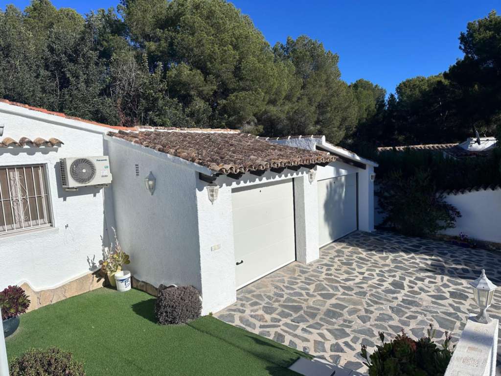 Villa en venta en Moraira, La Sabatera. Villa de una sola planta con 3 dormitorios, piscina privada, vistas al mar, orientación sur y dos garajes en 800 m², a 3 km del mar y del centro.