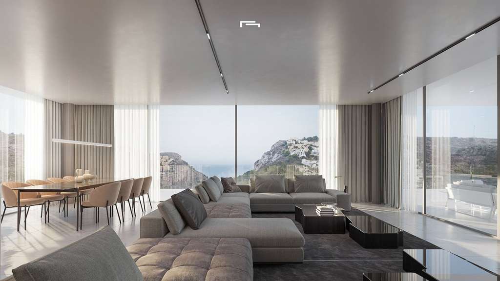 VILLA DE LUJO DE OBRA NUEVA CON VISTAS AL MAR EN MORAIRA Villa de lujo de obra nueva con vistas al mar en Moraira. La villa articula los espacios interiores a través de geometrías sencillas, puras y rotundas. Se accede a ella a través de una rampa y escaleras integradas en el terreno, apoyando la parte superior de la casa en un zócalo de piedra que da entrada a la vivienda. En la planta baja hay un garaje, un generoso vestíbulo de acceso junto a una gran bodega y un almacén y gimnasio. En la planta superior se encuentran las habitaciones principales de la casa, todas ellas con baño en suite y un gran espacio diáfano de más de 90m2 para albergar un espacio fluido de cocina comedor y salón en una vista panorámica de 180º del paisaje. Todo este espacio está rodeado por una amplia terraza, en cuya parte delantera cae un porche abierto de más de 50m2, proyectando hacia el exterior el interior de la casa y convirtiéndola en un espacio único. Una pieza geométrica única que proporciona unas impresionantes vistas del paisaje y que tiene de forma práctica y cuidada el programa y la funcionalidad del interior. La pureza geométrica y el diseño de la casa se traslada desde la composición arquitectónica hasta la ejecución del más mínimo detalle. Se han elegido soluciones técnicas y constructivas de última generación para trasladar a la vivienda las últimas novedades del mercado. Todo ello para conseguir una vivienda de lujo con las máximas prestaciones y con un diseño exquisito. Moraira es una pequeña ciudad con buenos restaurantes, bares y muchos supermercados alrededor. Hay una playa muy agradable justo al lado del pueblo que es ideal para las familias. El paseo marítimo ofrece unas vistas tremendas del Peñón de Ifach al otro lado de la bahía de Calpe. El camino de la costa de llegar allí es bien vale la pena hacer con algunas vistas espectaculares. Moraira situado a 1 hora 15 minutos al norte de la A7 desde el aeropuerto de Alicante es bastante fácil de llegar. Es aproximadamente la misma distancia o un poco menos al sur del aeropuerto de Valencia.
