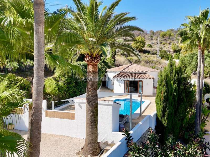 Le presentamos esta preciosa villa mediterránea de una sola planta situada en una parcela llana en la tranquila y verde zona de Benimeit, en Moraira. Ideal para personas que buscan una vivienda fácil de mantener, con tranquilidad, espacio y comodidad. La vivienda está situada en una parcela amplia y llana de 849 m2, en una calle tranquila con tráfico local, a menos de 8 minutos en coche del centro de Moraira y de la playa. Al entrar en la parcela vallada, hay espacio suficiente para aparcar varios coches en la propiedad. Lo que llama la atención inmediatamente son las hermosas palmeras maduras que acentúan el ambiente mediterráneo de la vivienda.