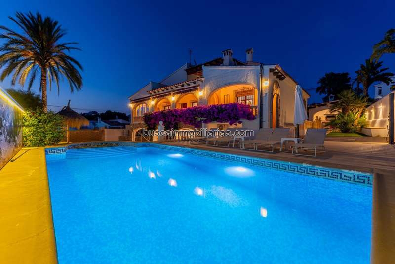 Planta principal: Un amplio salóncomedor con chimenea Tres dormitorios dobles en la planta principal Una cocina independiente totalmente equipada Un baño con ducha Un aseo independiente Una naya muy espaciosaAdemás, cabe destacar que, a este nivel la parcela cuenta con espacio de aparcamiento para 3 coches, accesible a través de un portón eléctricoMediante escalera interna se accede a la planta alta, donde encontramos: El dormitorio principal con baño en suite (con bañera y ducha)Un espacioso balcón con vistas al mar.Casa de invitados (planta baja, totalmente independiente): Un amplio salóncomedor Tres amplios dormitorios Una cocina independiente totalmente equipada Un baño con ducha Un trastero Un porche espacioso Amplio garaje y espacio adicional en la parcela para aparcar otros vehículosEn el exterior, disfrute de las distintas terrazas conectadas al salón/comedor, que ofrecen el lugar perfecto para relajarse. Alrededor de la piscina se han creado varias zonas de solárium, para disfrutar del sol con total comodidad. Además, hay una ducha exterior con agua fría y caliente, y cerca de la zona de la piscina se encuentra un aseo exterior independiente que también contribuye a la comodidad. La amplia cocina de verano cubierta es ideal para cocinar y comer al aire libre, mientras que los más pequeños pueden divertirse en su propio parque infantil en el jardín.Además de todo esto, la casa también está equipada con: Calefacción central por radiadores Aire acondicionado en todos los dormitorios (aire frio y calor) Sistema de calefacción para la piscina Garaje TrasteroEsta propiedad representa una oportunidad única para quienes buscan una villa versátil, con múltiples posibilidades y ubicada a solo unos minutos a pie del centro de Moraira y sus playas.No deje pasar la oportunidad de visitarla; estaremos encantados de concertar una cita.Aviso legal: La superficie construida, el tamaño del terreno y otras dimensiones y datos mencionados en esta publicación se basan en la información proporcionada por el propietario. Aunque hemos recopilado estos datos con la debida diligencia, no se puede derivar ningún derecho de los mismos.