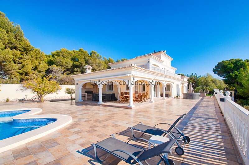 Gran villa de dos plantas en la zona de Pla del Mar en Moraira con vistas al mar al suroeste en una doble parcela. La planta baja incluye salón con chimenea, comedor, cocina moderna con despensa, tres dormitorios (uno en suite con vestidor) y aseo para invitados. La planta superior tiene dos suites con vestidores, baños y acceso a terrazas cubiertas. Las características exteriores incluyen piscina climatizada con tobogán, pérgola sombreadora, amplias terrazas con jacuzzi, césped artificial, zona de barbacoa, garaje para tres coches y cochera. Equipado con calefacción central de gas, aire acondicionado y sistema de seguridad.